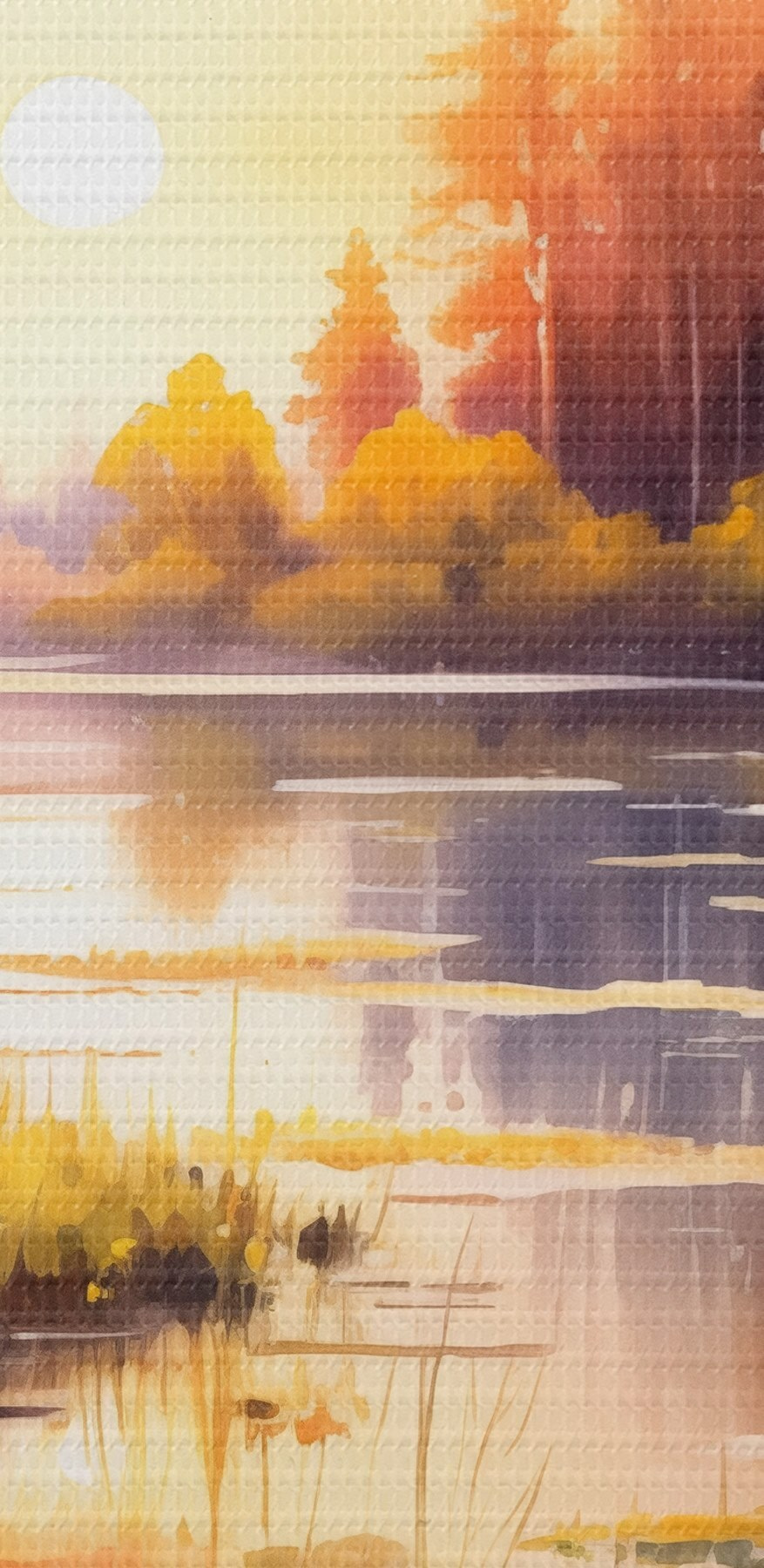 Wandbilder Sonnenaufgang auf dem Waldsee, Aquarell, Bäume, Blumen, sanftes Licht s41644