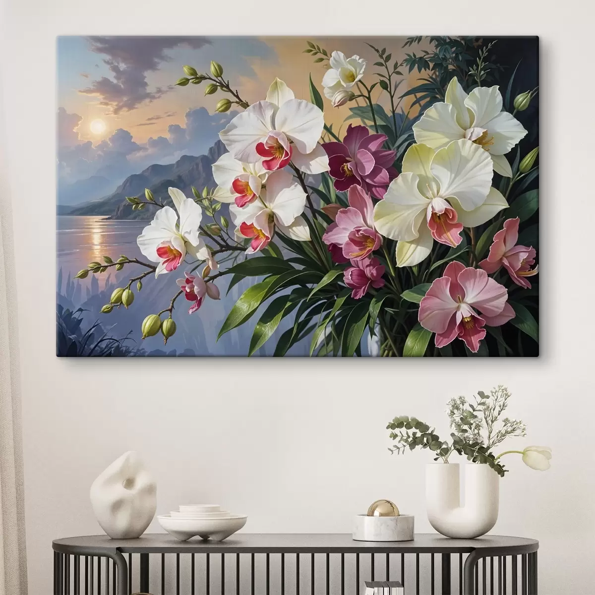 Wandbilder Ein lebendiger Strauß tropischer Blumen mit Orchideen und üppigem grünem Laub vor dem Hintergrund einer Meereslandschaft Art. s41713