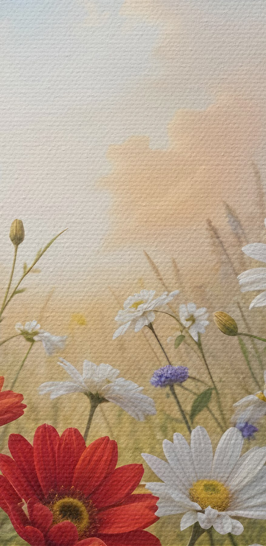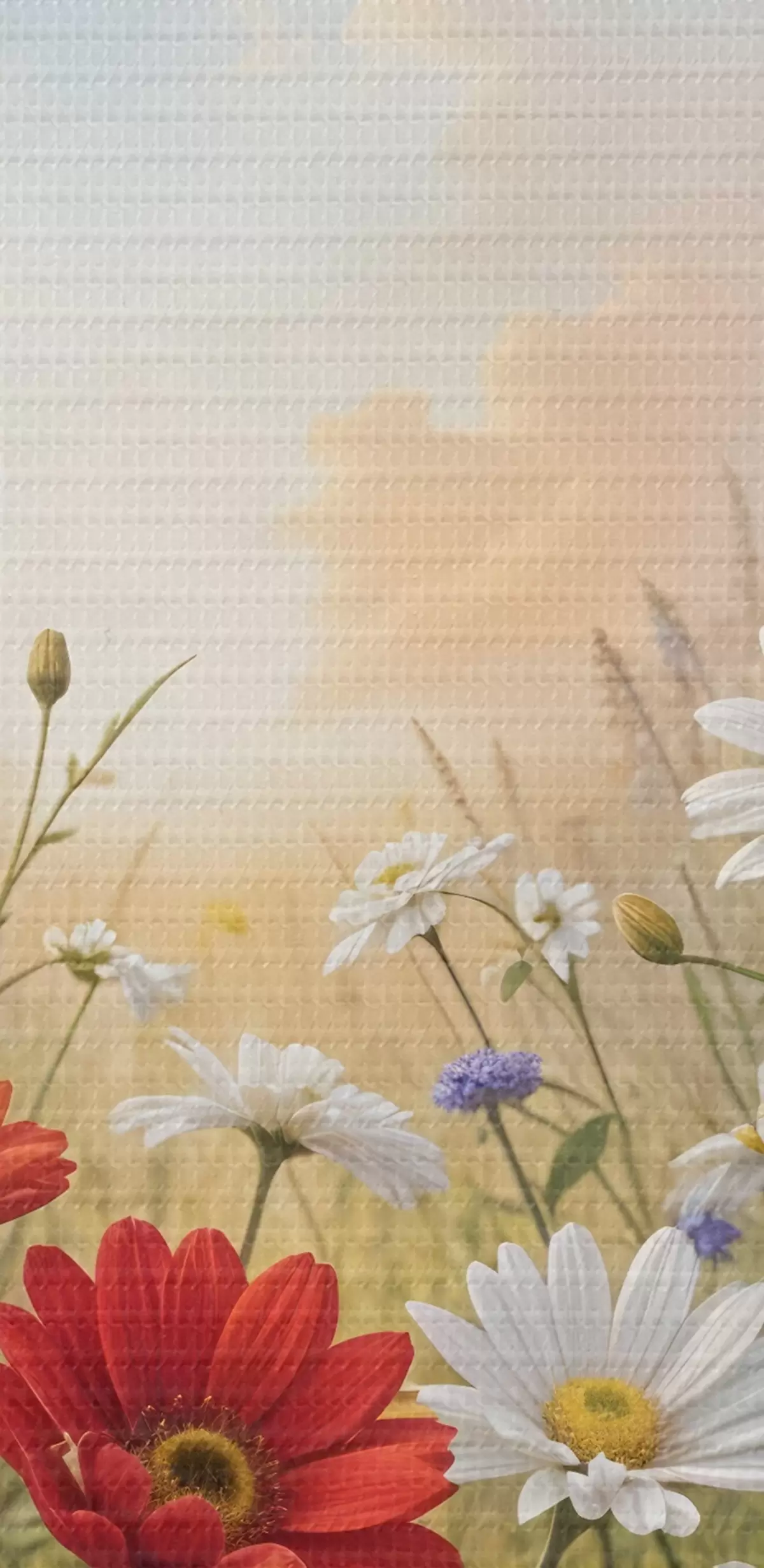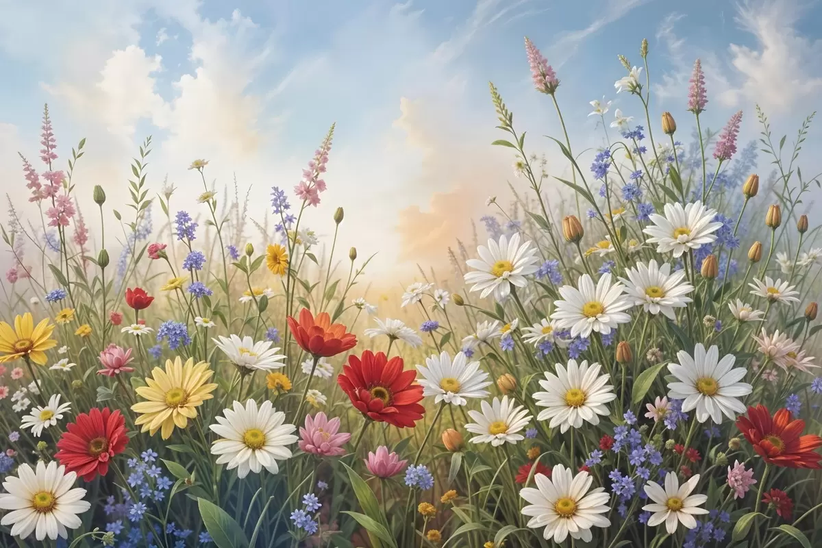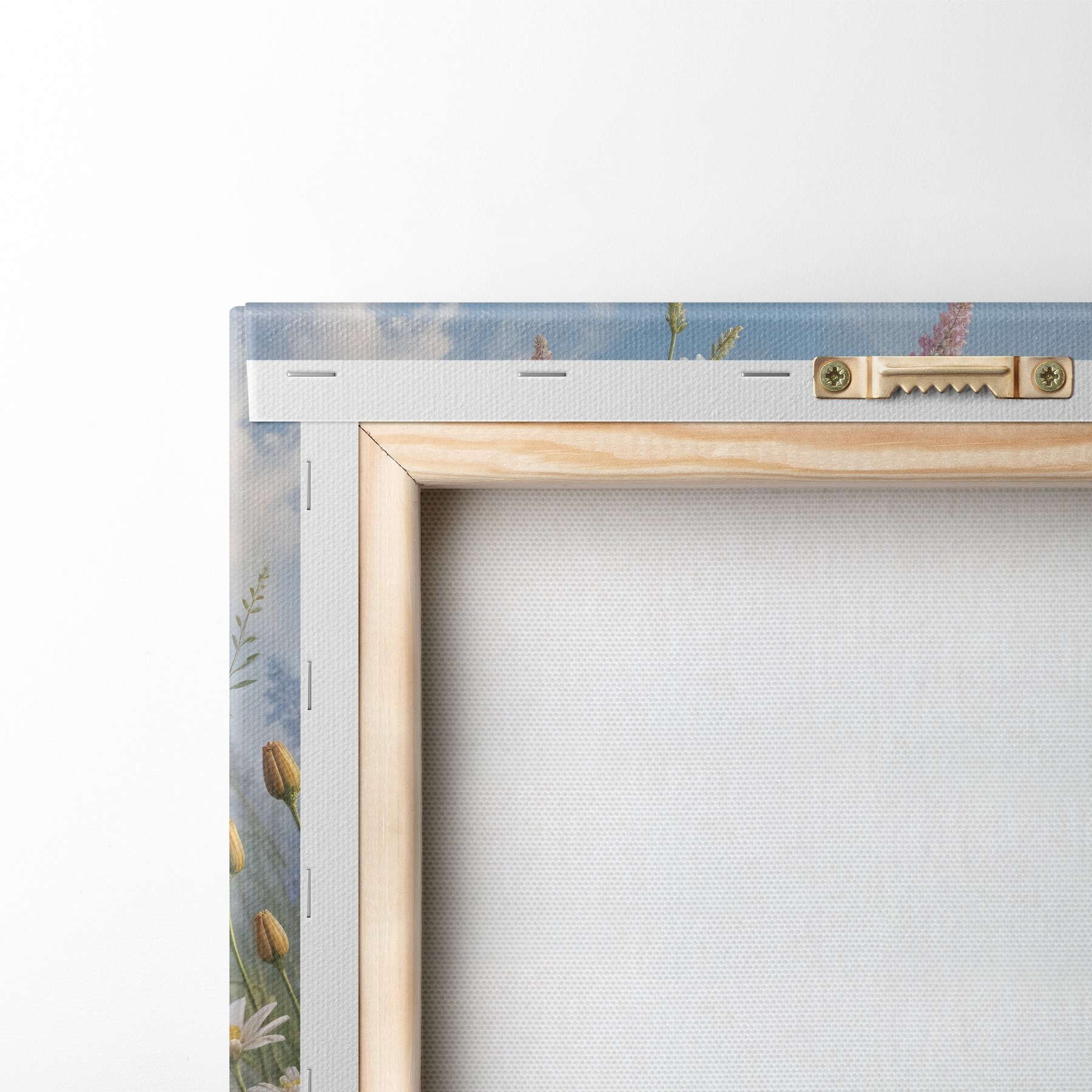 Wandbilder Ein Feld mit farbenfrohen Wildblumen wie Gänseblümchen, Mohnblumen und anderen blühenden Pflanzen vor einem blauen Himmel s41725