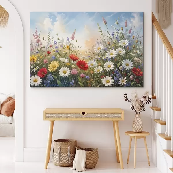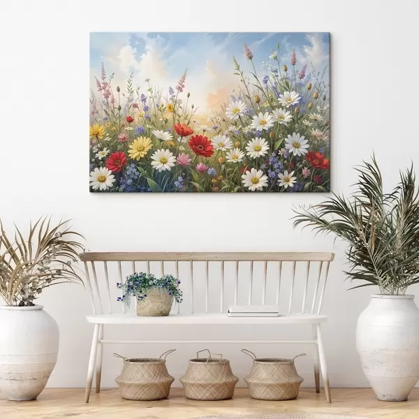 Wandbilder Ein Feld mit farbenfrohen Wildblumen wie Gänseblümchen, Mohnblumen und anderen blühenden Pflanzen vor einem blauen Himmel Art. s41725