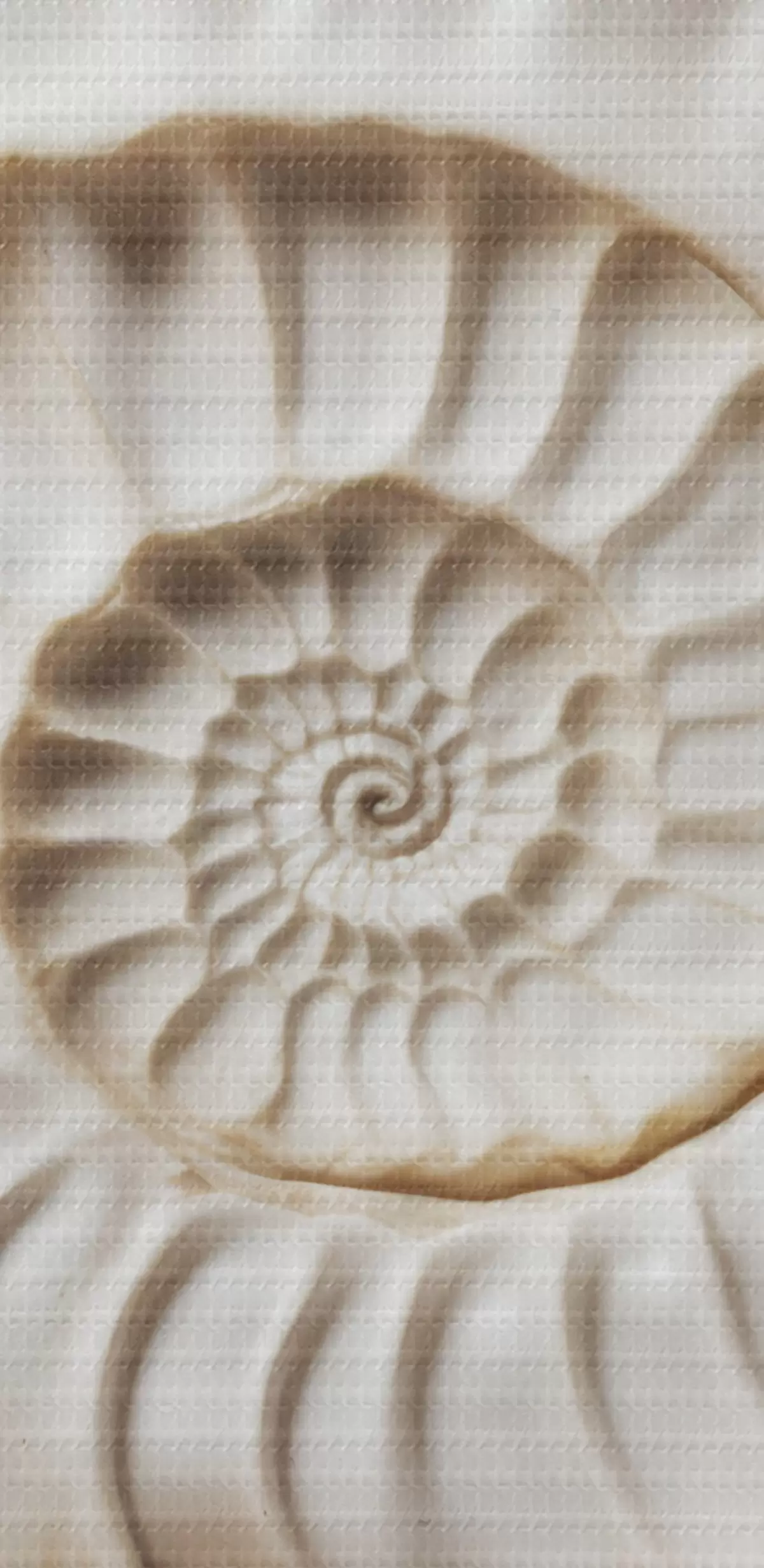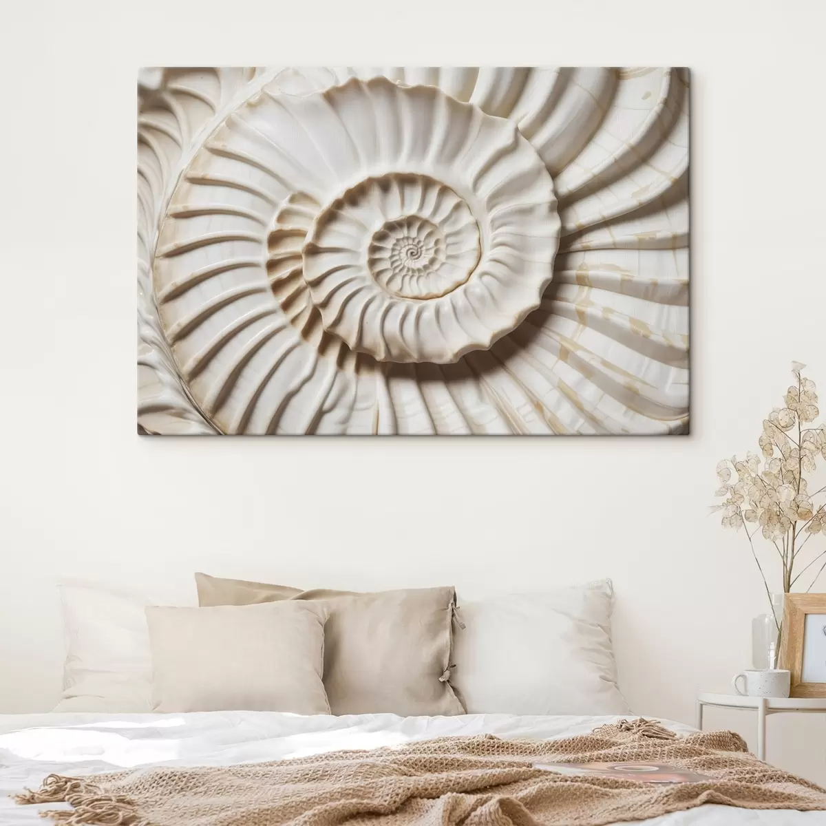 Wandbilder Weiße Spiralmuschel, die ihr kompliziertes und detailliertes Muster zur Schau stellt Art. s41728