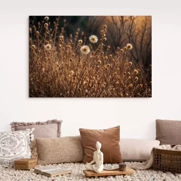 Wandbilder Weiße Gänseblümchen in einem Feld aus vertrocknetem Gras und Stängeln, im warmen Abendsonnenlicht Art. s41735