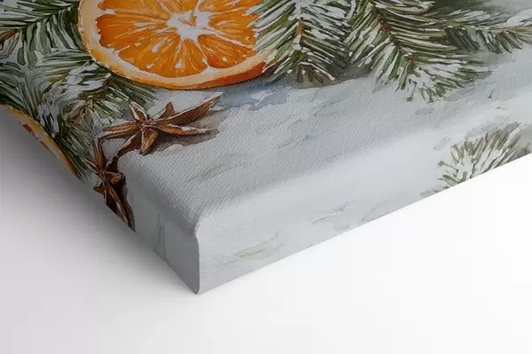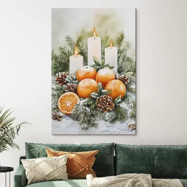 Wandbilder Weihnachtsdekoration mit Kerzen, Tannenbaum, Zapfen und Orangen, Aquarellstil Art. s41951