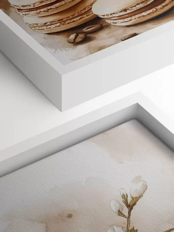 Wandbilder Makronen, Tasse Kaffee, Aquarellstil, Beigetöne, Jasminblüten s41965
