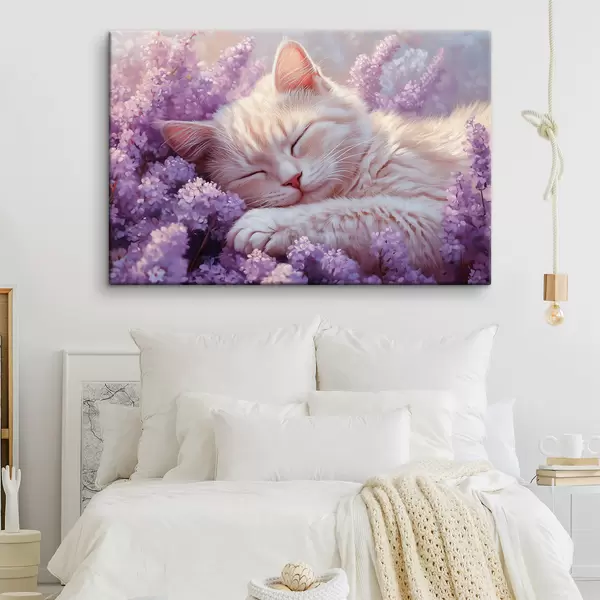 Wandbilder katze auf lila Blumen liegend Art. s42012