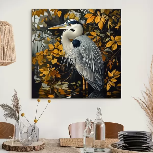 Wandbilder Ein Reiher im Wasser vor einem Hintergrund aus Herbstblättern Art. s42041