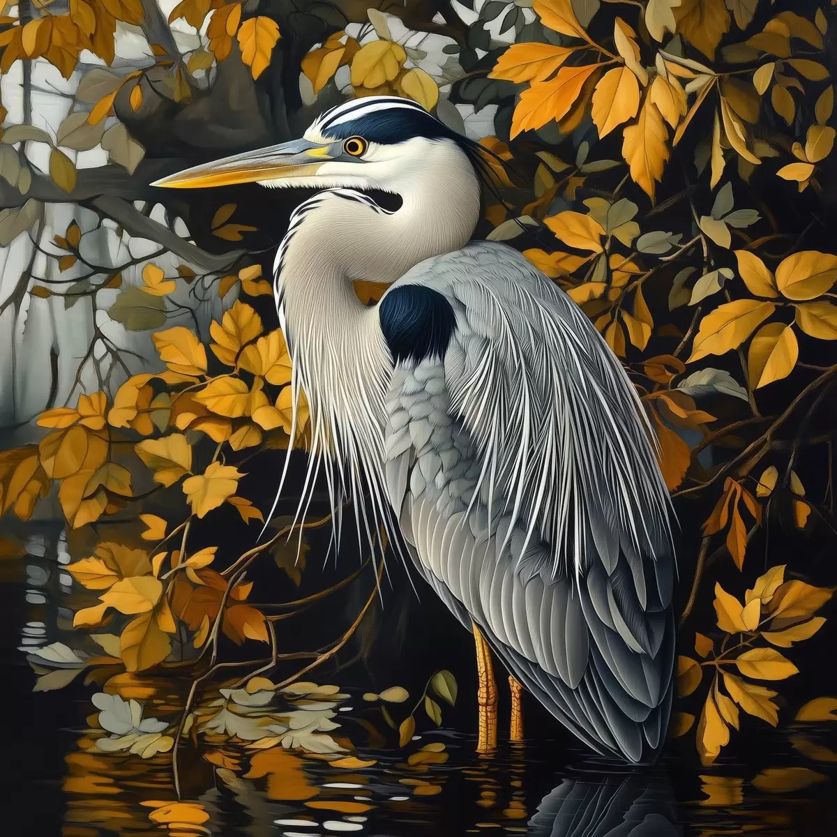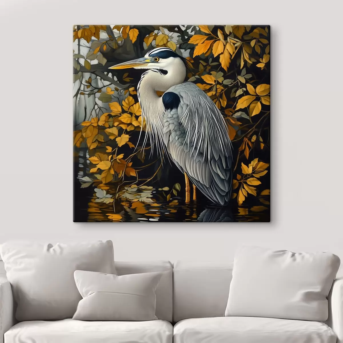 Wandbilder Ein Reiher im Wasser vor einem Hintergrund aus Herbstblättern Art. s42041