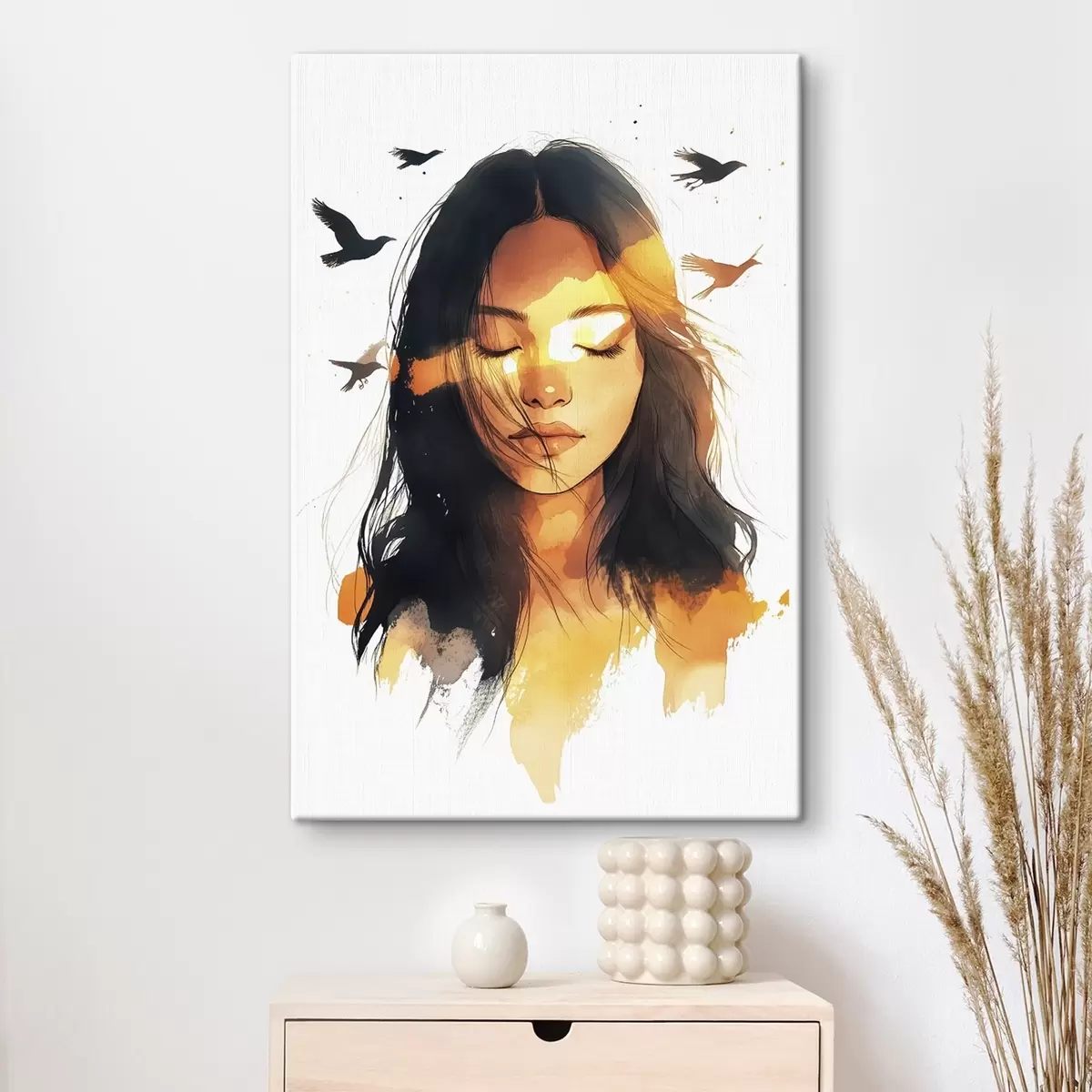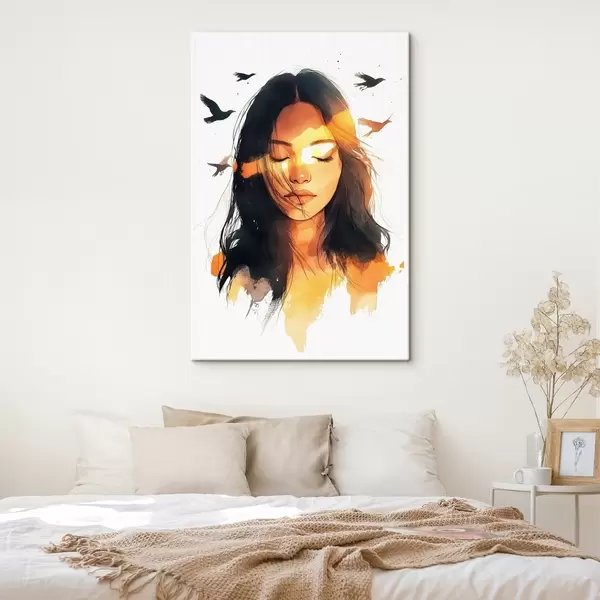 Wandbilder Aquarell-Stil Porträt, schönes Mädchen, Sonnenlicht, fliegende Vögel s42198
