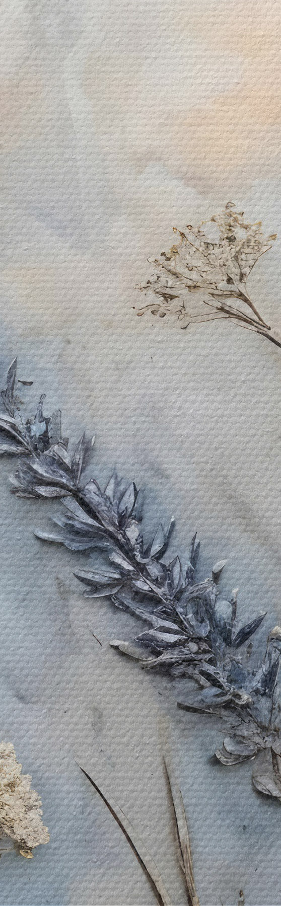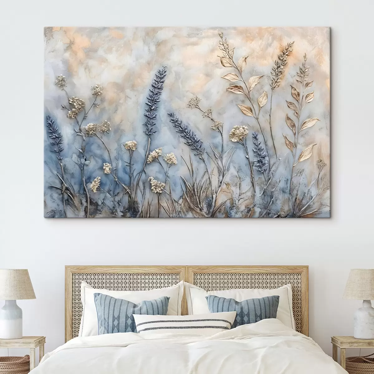 Wandbilder Ein Feld mit verschiedenen Wildblumen und Pflanzen in Blau-, Weiß- und Beigetönen vor einem weichen, dunstigen Hintergrund s42214