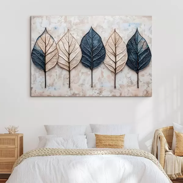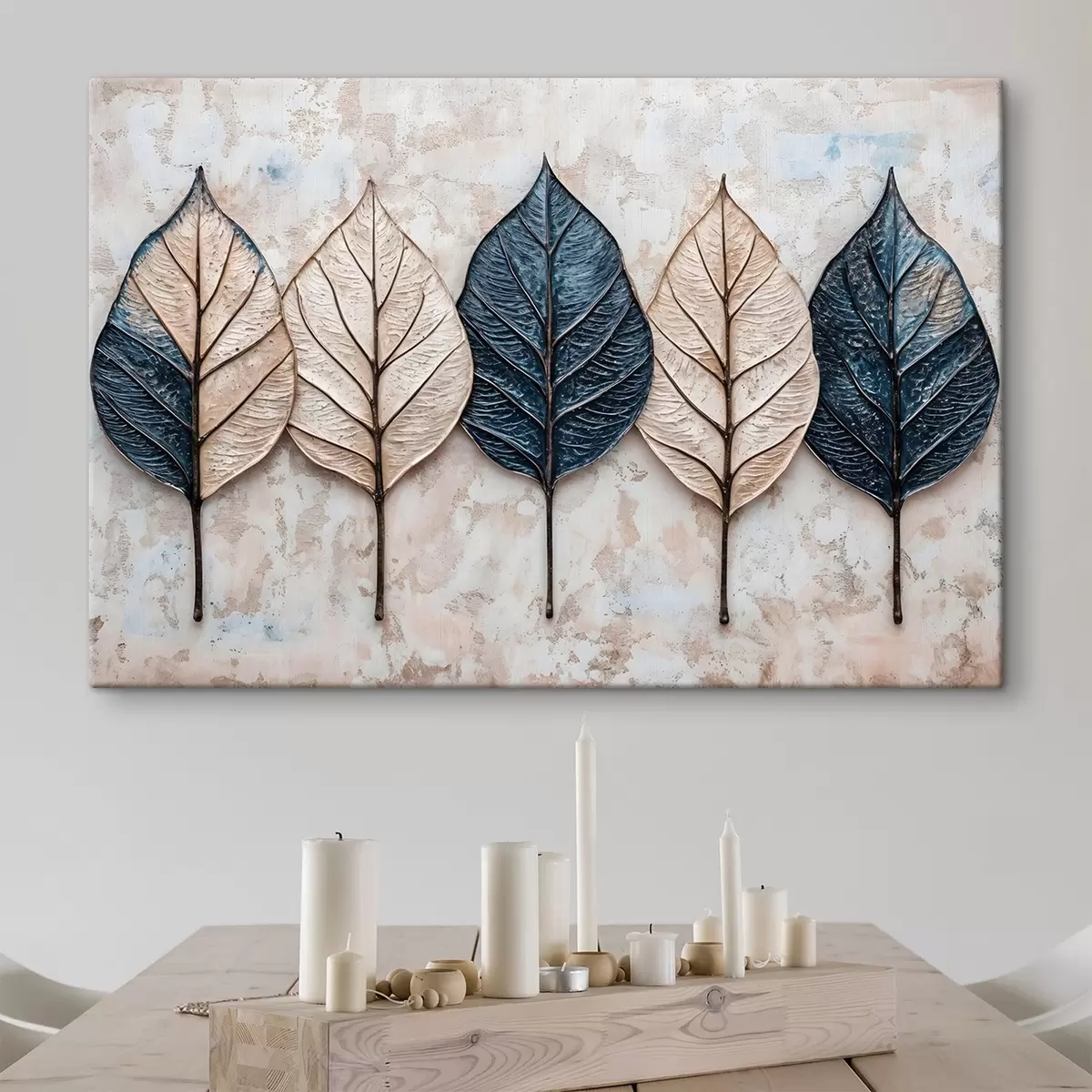 Wandbilder Verschiedene abstrakte Herbstblätter in verschiedenen Braun-, Beige- und Blautönen, die in einer Reihe auf einem hellen Hintergrund angeordnet sind Art. s42217