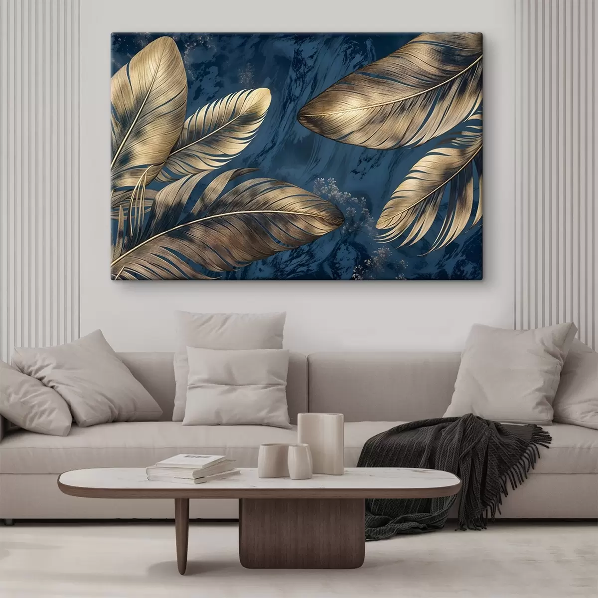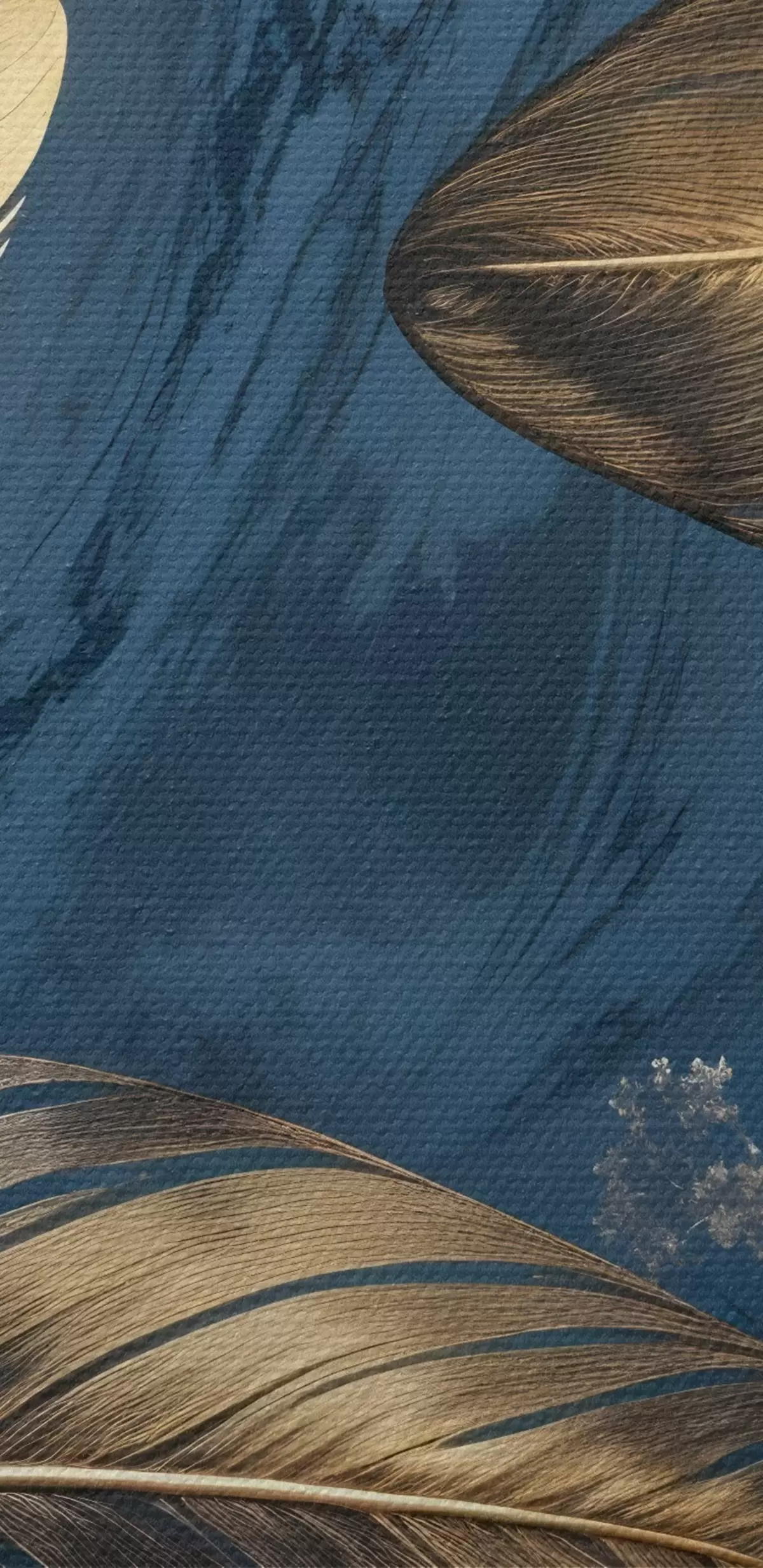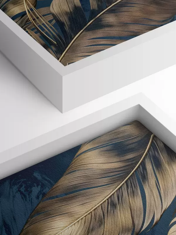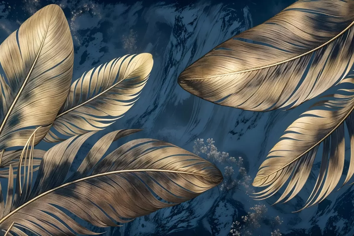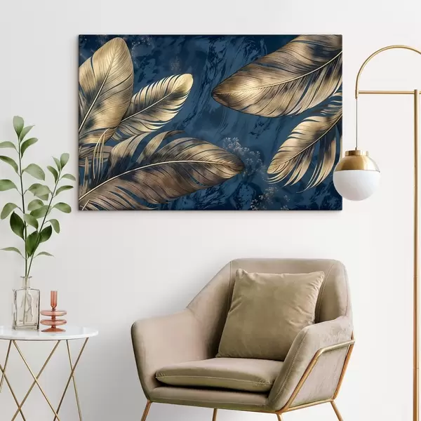 Wandbilder Gelbe und beigefarbene abstrakte dekorative Federn, die auf einem dunkelblauen strukturierten Hintergrund schweben Art. s42218