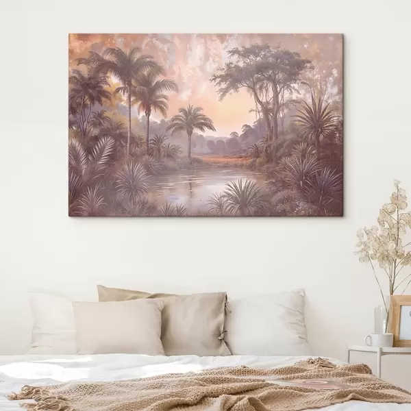 Wandbilder Eine tropisch strukturierte Landschaft mit einem ruhigen See, umgeben von üppigen Palmen und anderem Laub Art. s42219