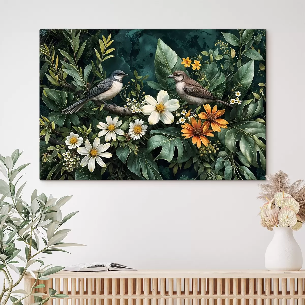 Wandbilder Kleine Vögel sitzen auf Zweigen, umgeben von üppigem tropischen Laub, darunter große grüne Blätter und bunte Blumen Art. s42220