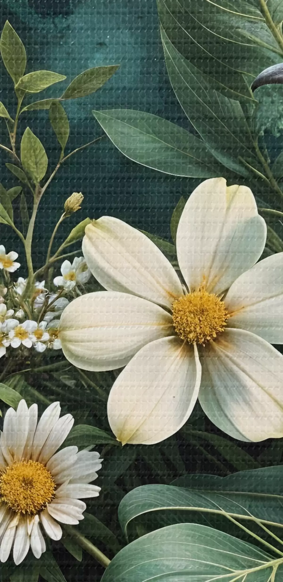 Wandbilder Kleine Vögel sitzen auf Zweigen, umgeben von üppigem tropischen Laub, darunter große grüne Blätter und bunte Blumen s42220