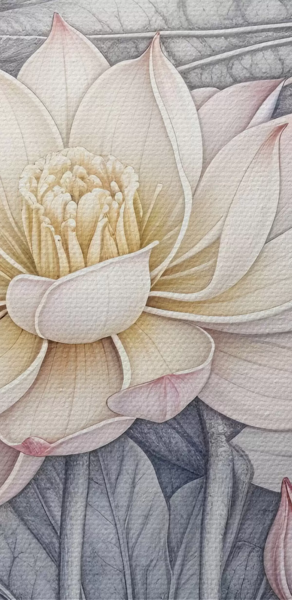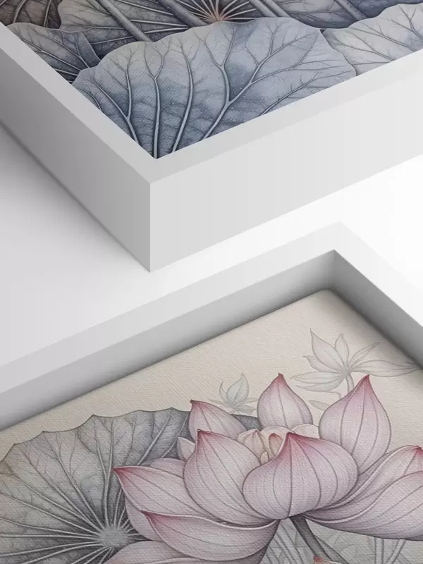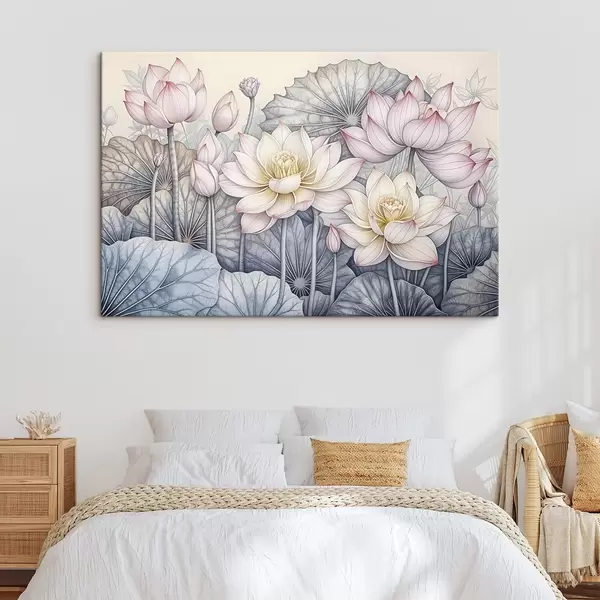 Wandbilder Große rosa und weiße Lotusblumen mit grünen Blättern und Stängeln auf einem hellen Hintergrund mit detaillierten Blütenblättern und Zentren Art. s42221