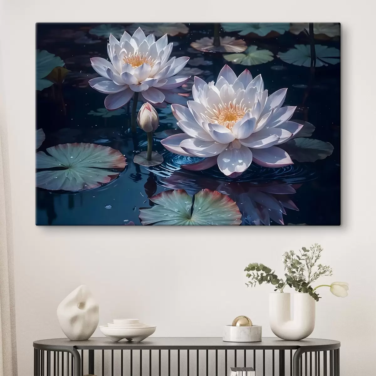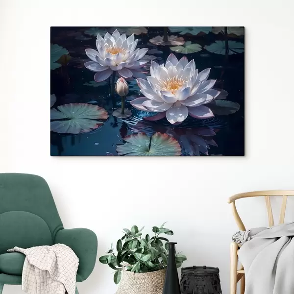 Wandbilder Weiße Lotosblüten schwimmen auf einem ruhigen Teich mit Seerosenblättern Art. s42225