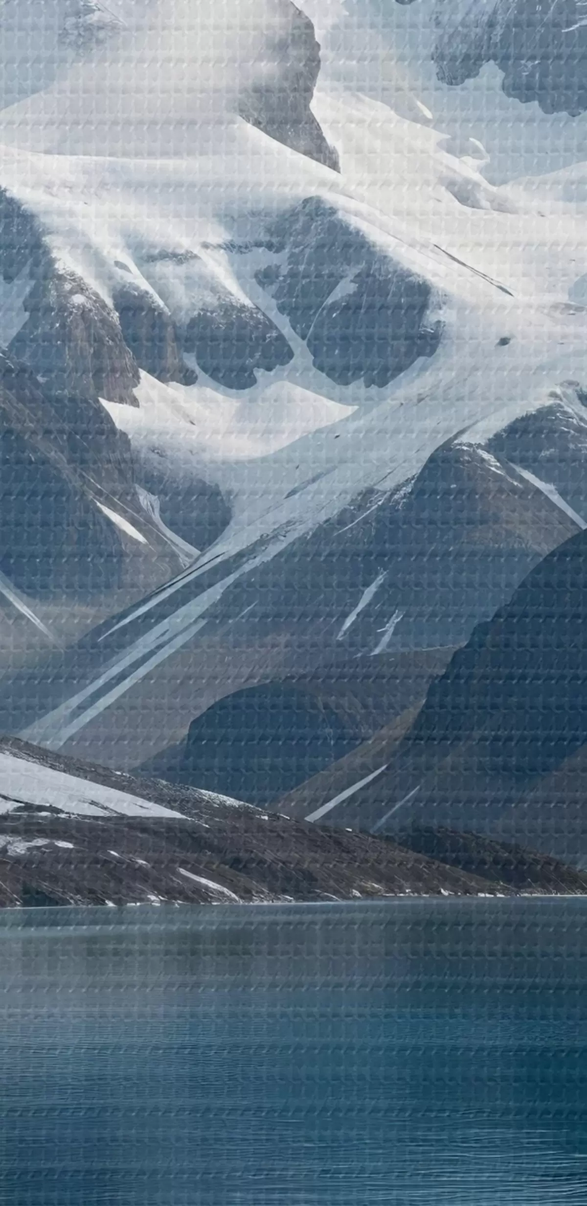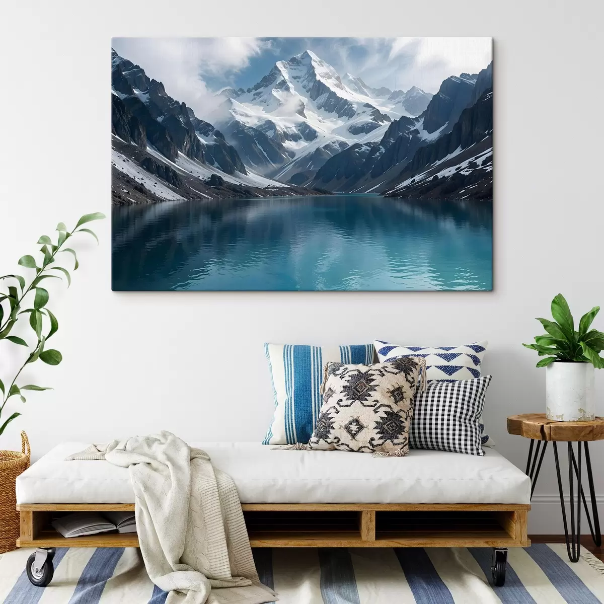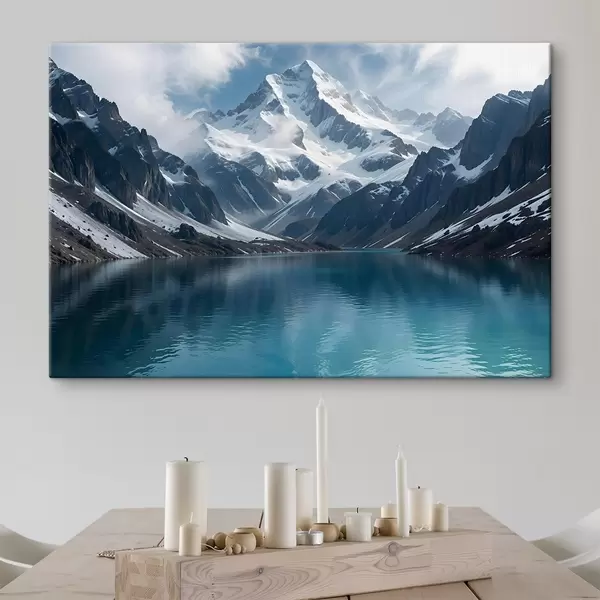 Wandbilder Ein schneebedeckter Berggipfel, der sich in einem ruhigen türkisfarbenen See spiegelt, umgeben von felsigem Gelände und dramatischen Wolken Art. s42232