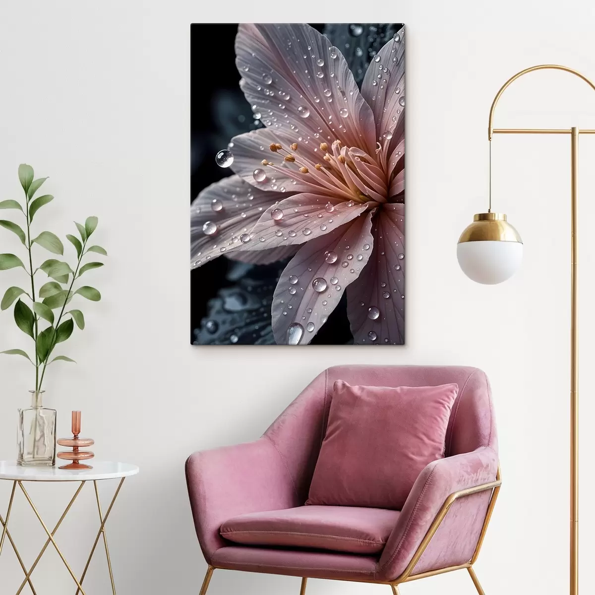Wandbilder Nahaufnahme einer rosafarbenen Blume mit zarten Blütenblättern, die mit Wassertropfen bedeckt sind, vor einem dunklen Hintergrund s42237