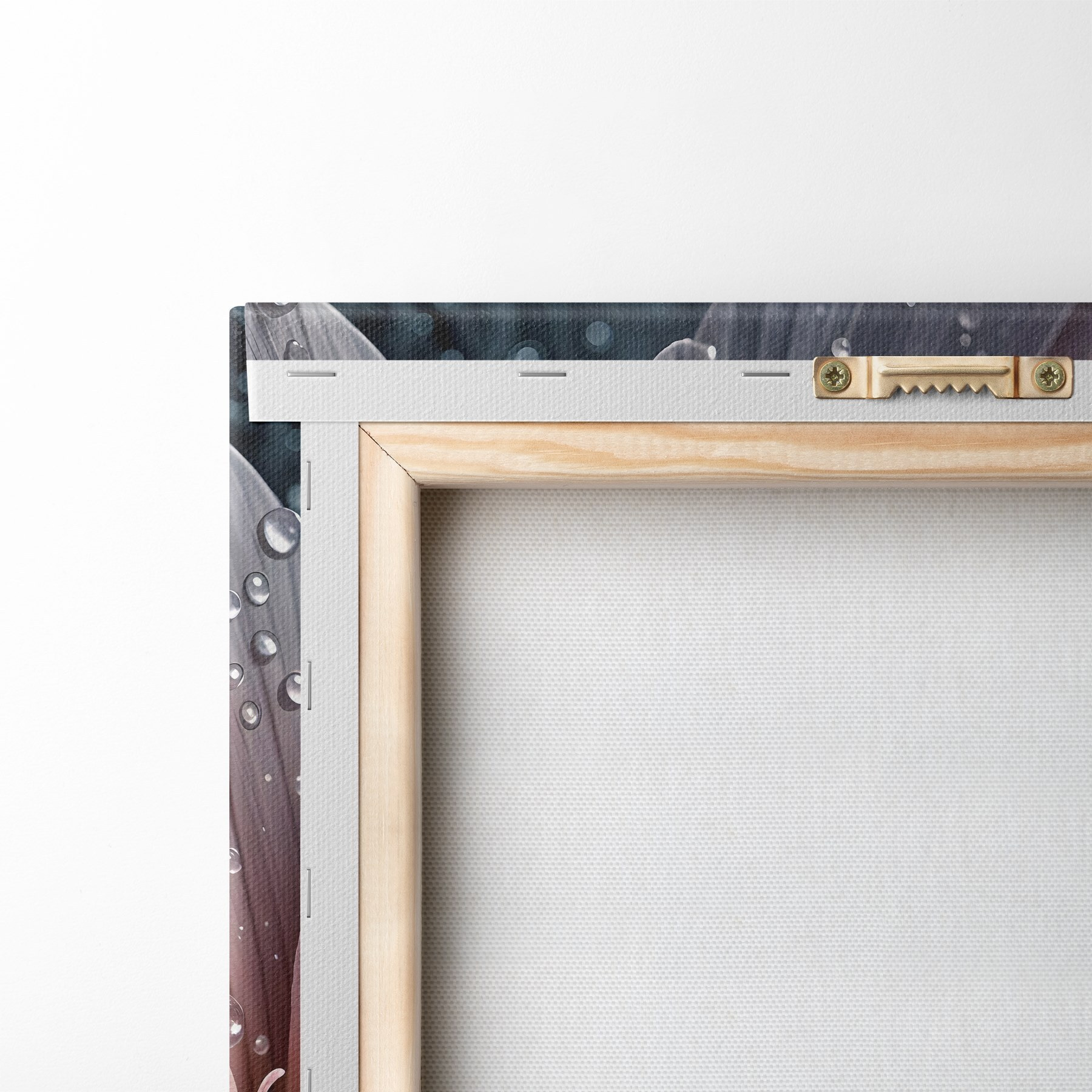 Wandbilder Nahaufnahme einer rosafarbenen Blume mit zarten Blütenblättern, die mit Wassertropfen bedeckt sind, vor einem dunklen Hintergrund Art. s42237
