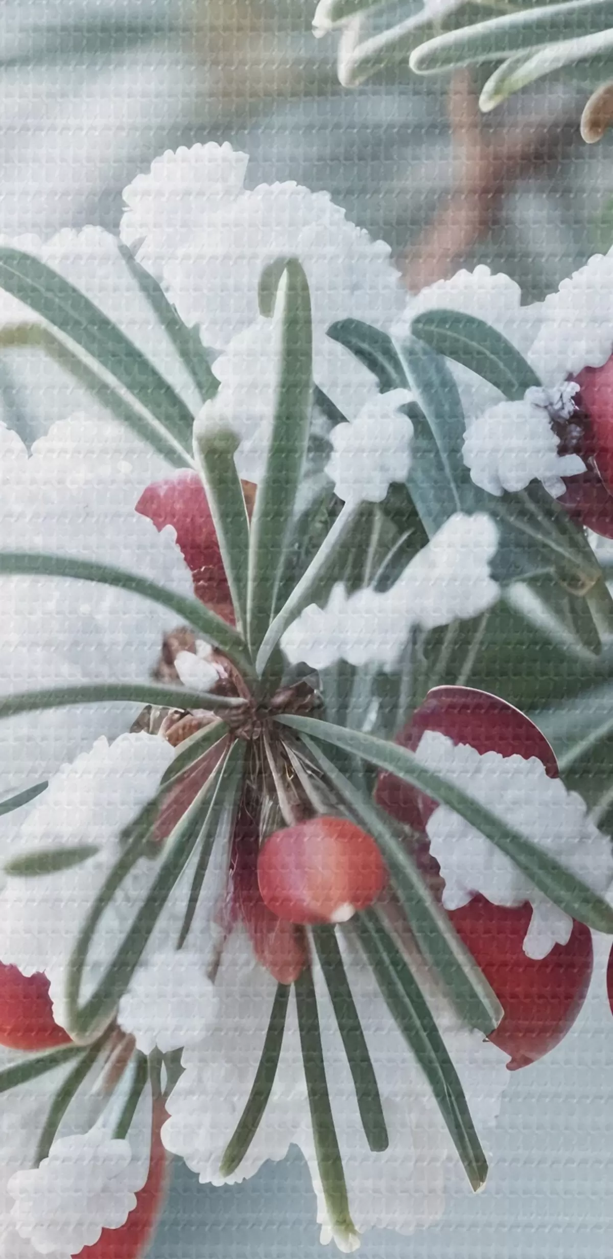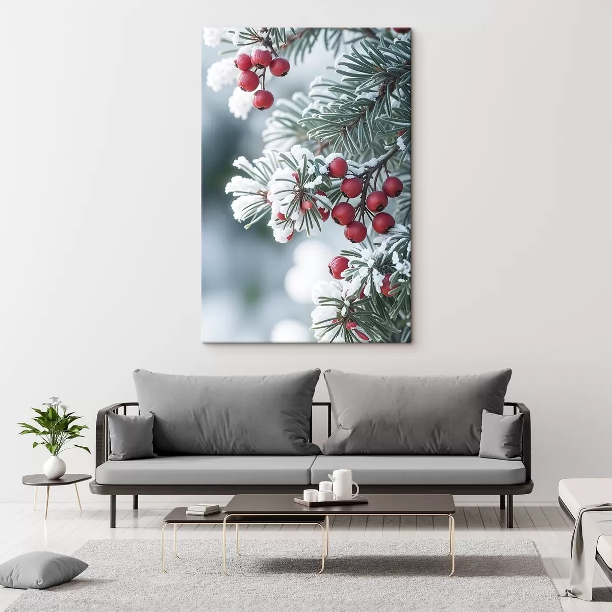 Wandbilder Verschneiter Tannenzweig mit roten Beeren, Winterszene s42238