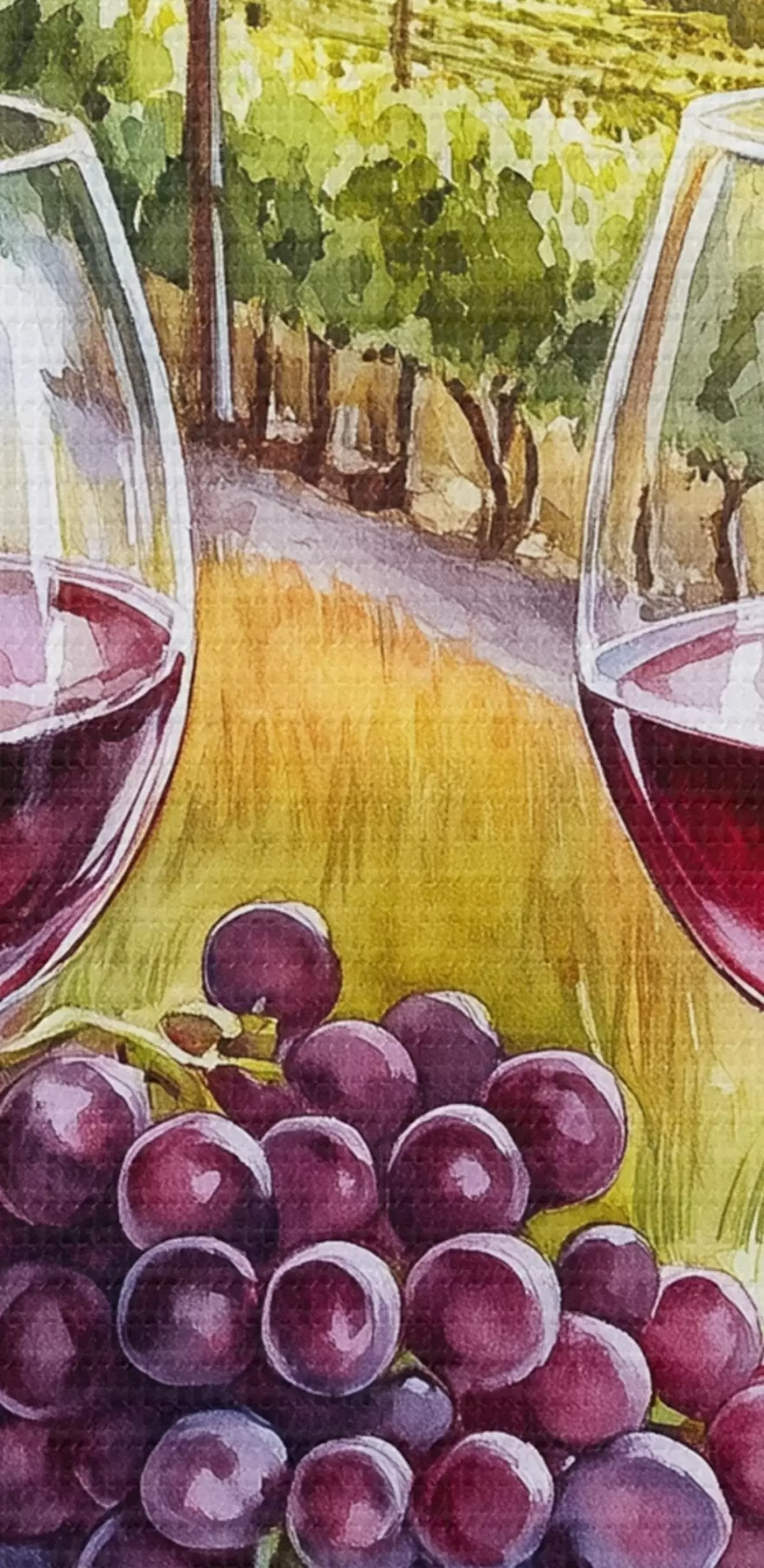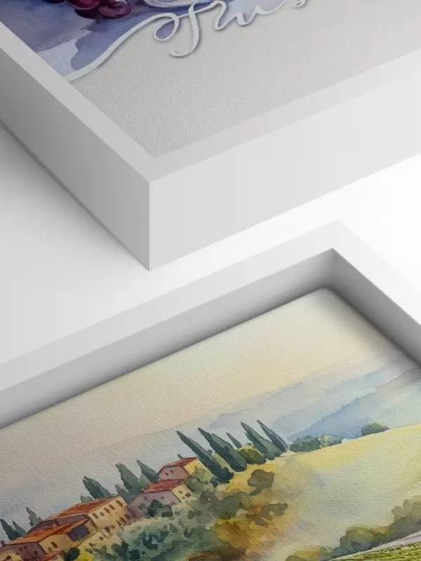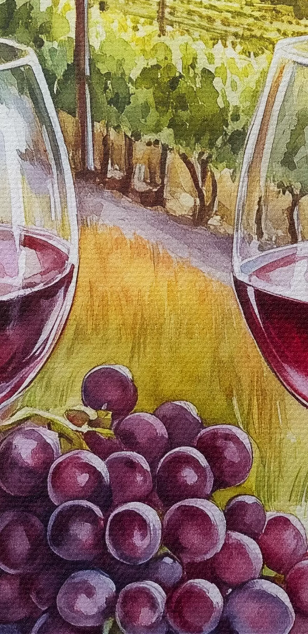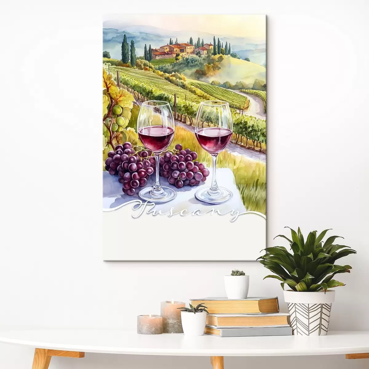 Wandbilder Toskana Landschaften, Aquarell-Stil, Weingläser, Trauben, Sonnenuntergang Art. s42439