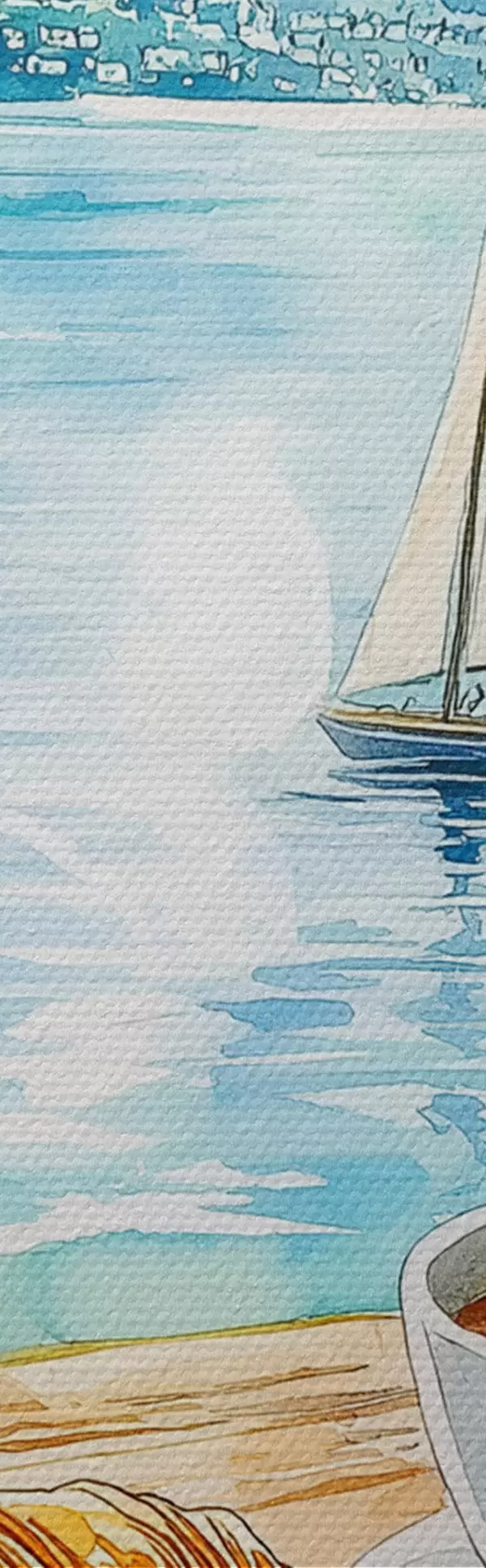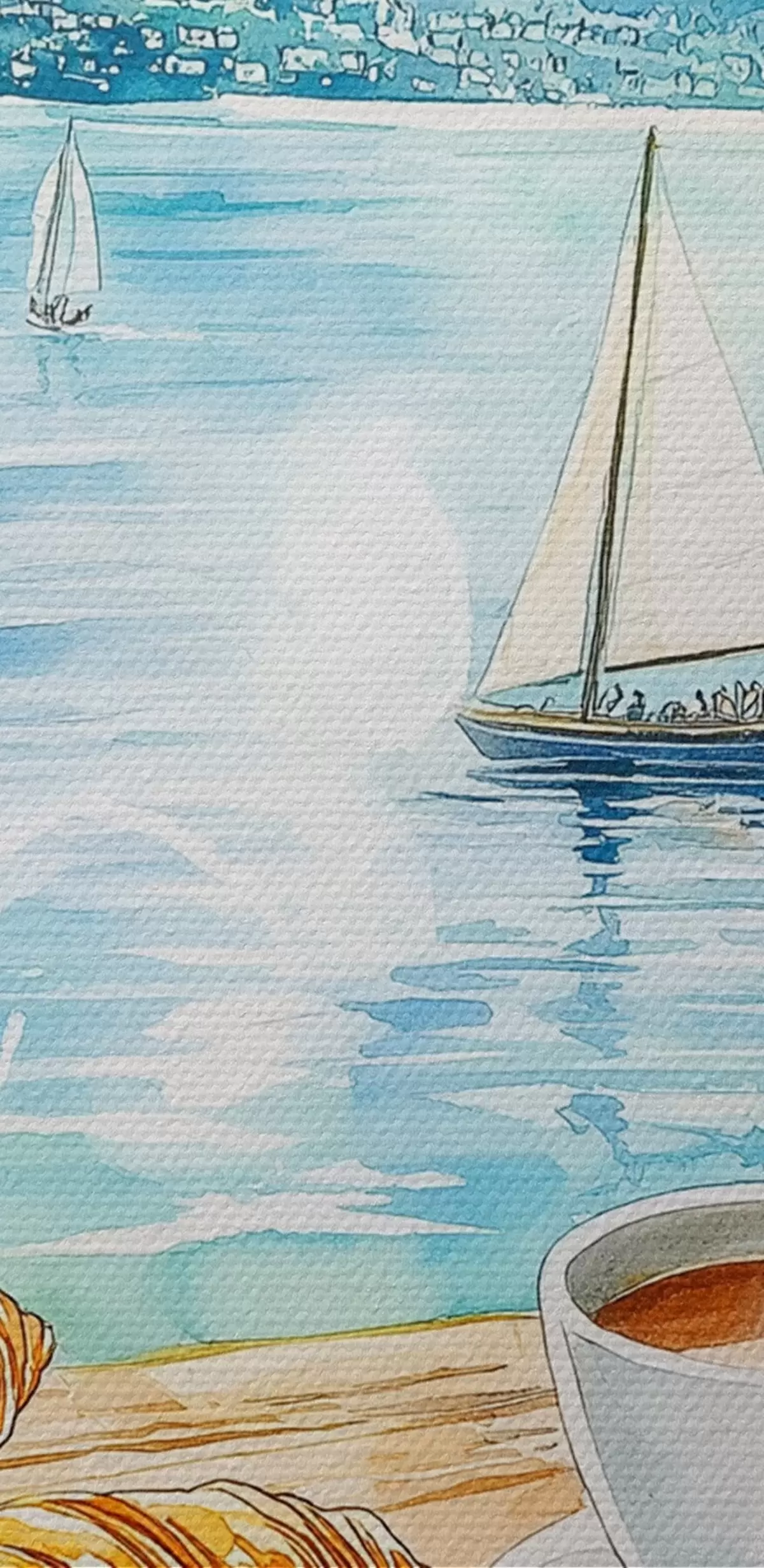 Wandbilder Sommer See mit Segelbooten, Tassen Kaffee, Croissants, Aquarell-Stil Art. s42441
