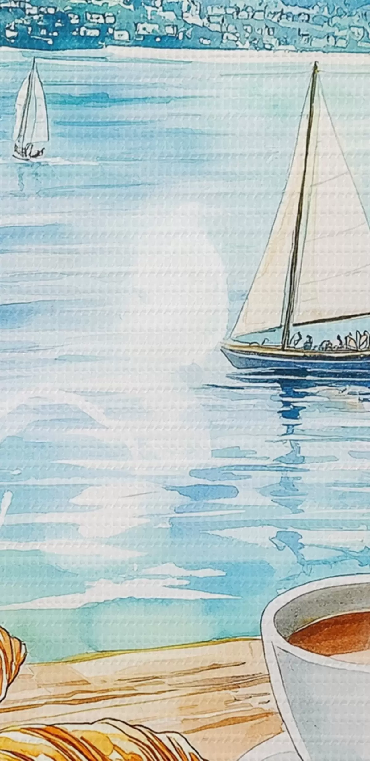 Wandbilder Sommer See mit Segelbooten, Tassen Kaffee, Croissants, Aquarell-Stil s42441