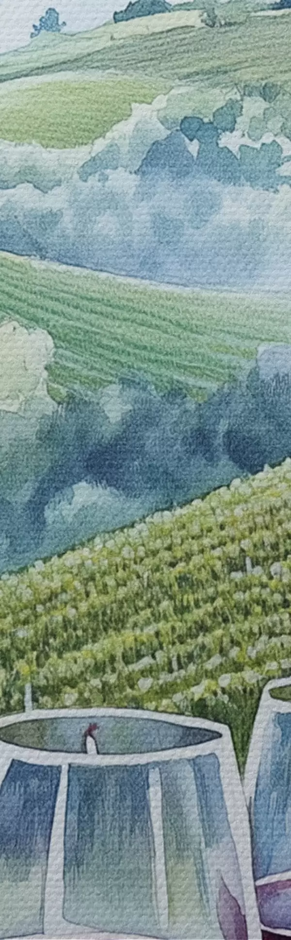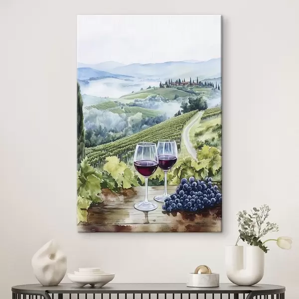 Wandbilder Landschaft der Toskana, Weinberge, Weingläser, Aquarellstil Art. s42445