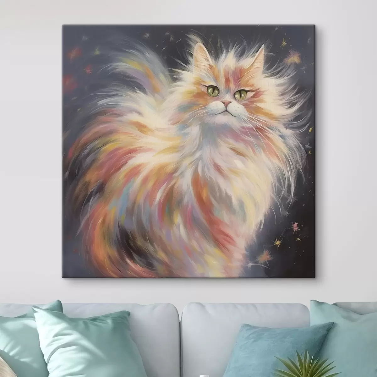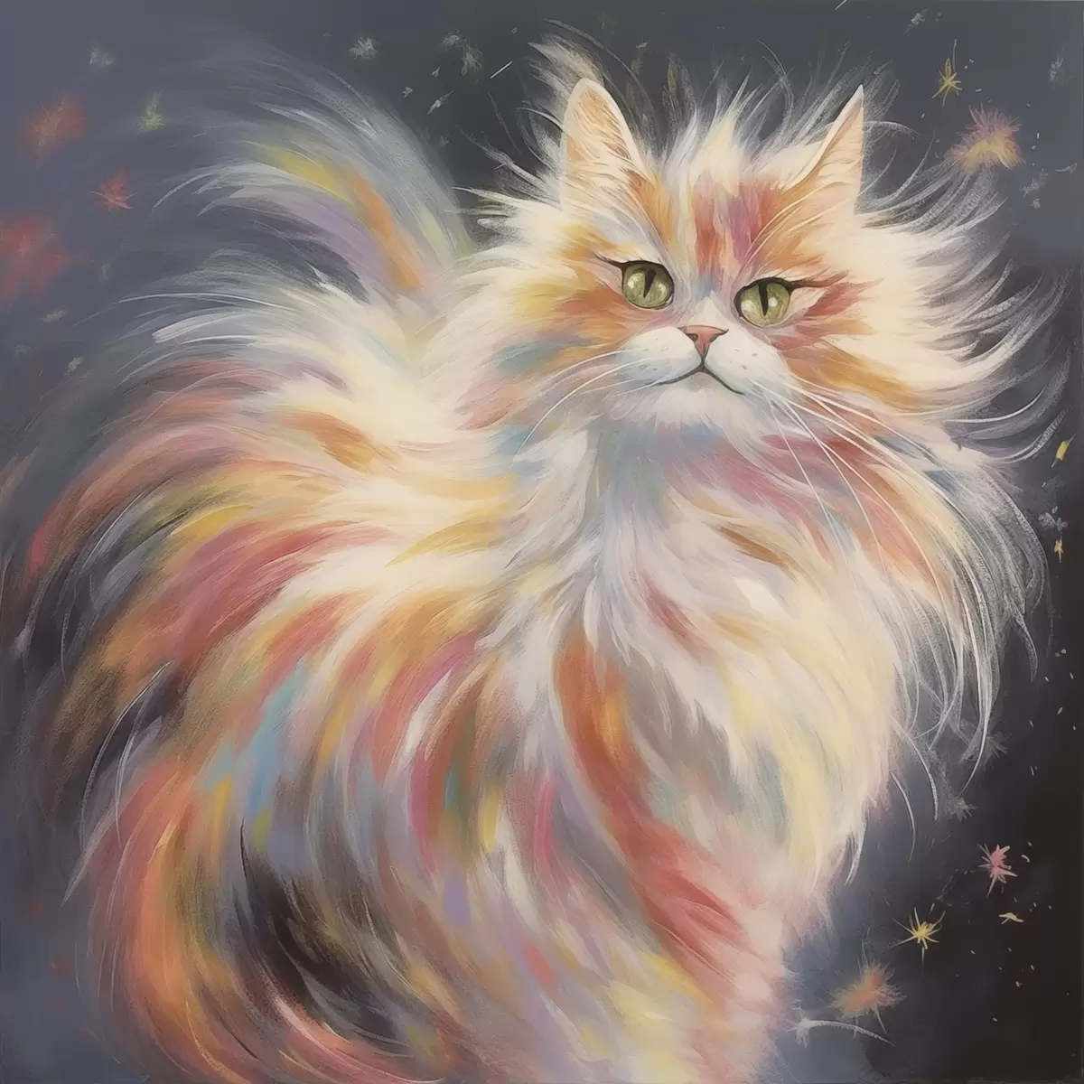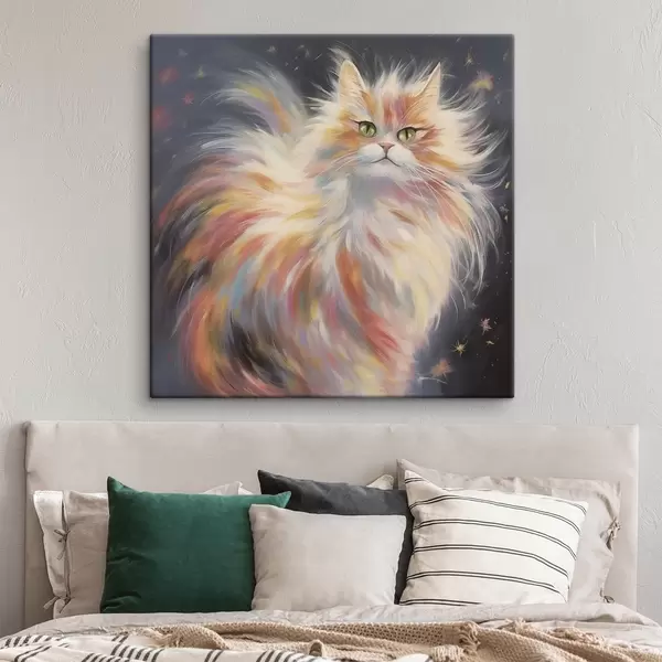 Wandbilder Flauschige Katze mit buntem Fell auf dunklem Hintergrund s42484