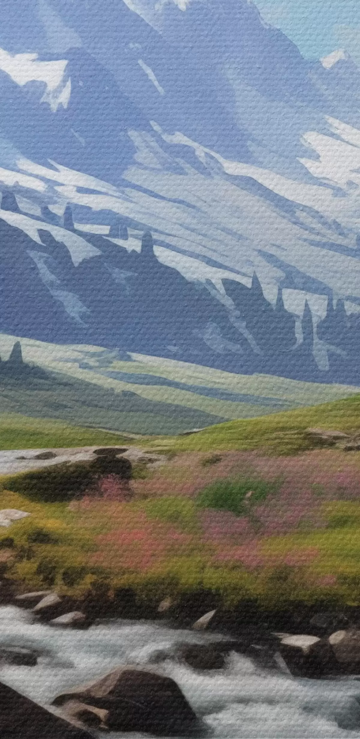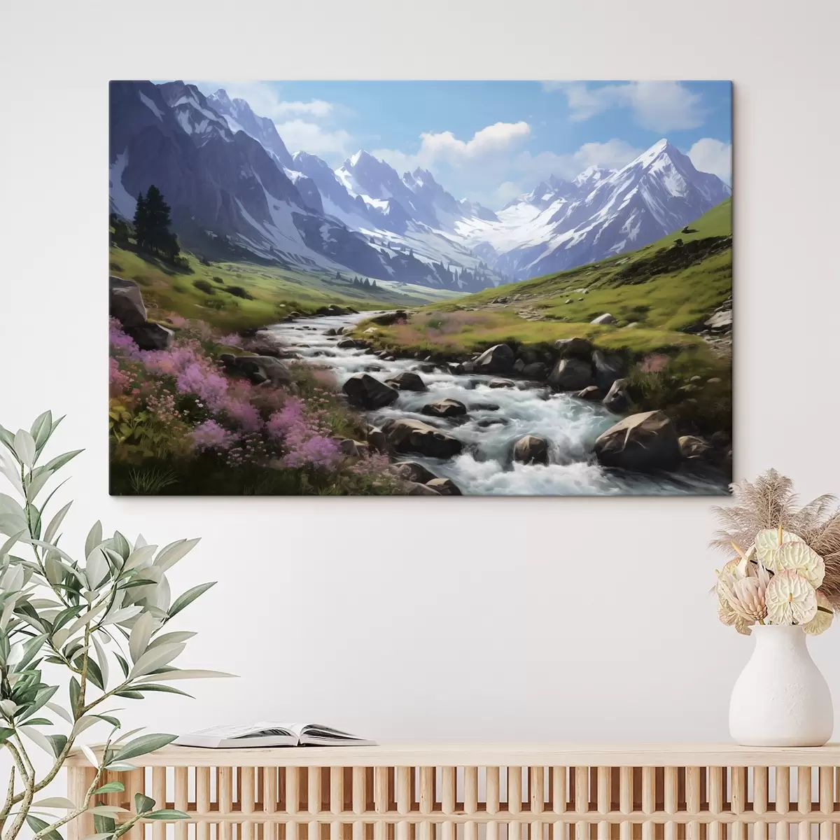 Wandbilder Eine Berglandschaft mit einem rauschenden Bach, blühenden Wiesen und schneebedeckten Gipfeln am Horizont unter einem strahlend blauen Himmel. Art. s42563