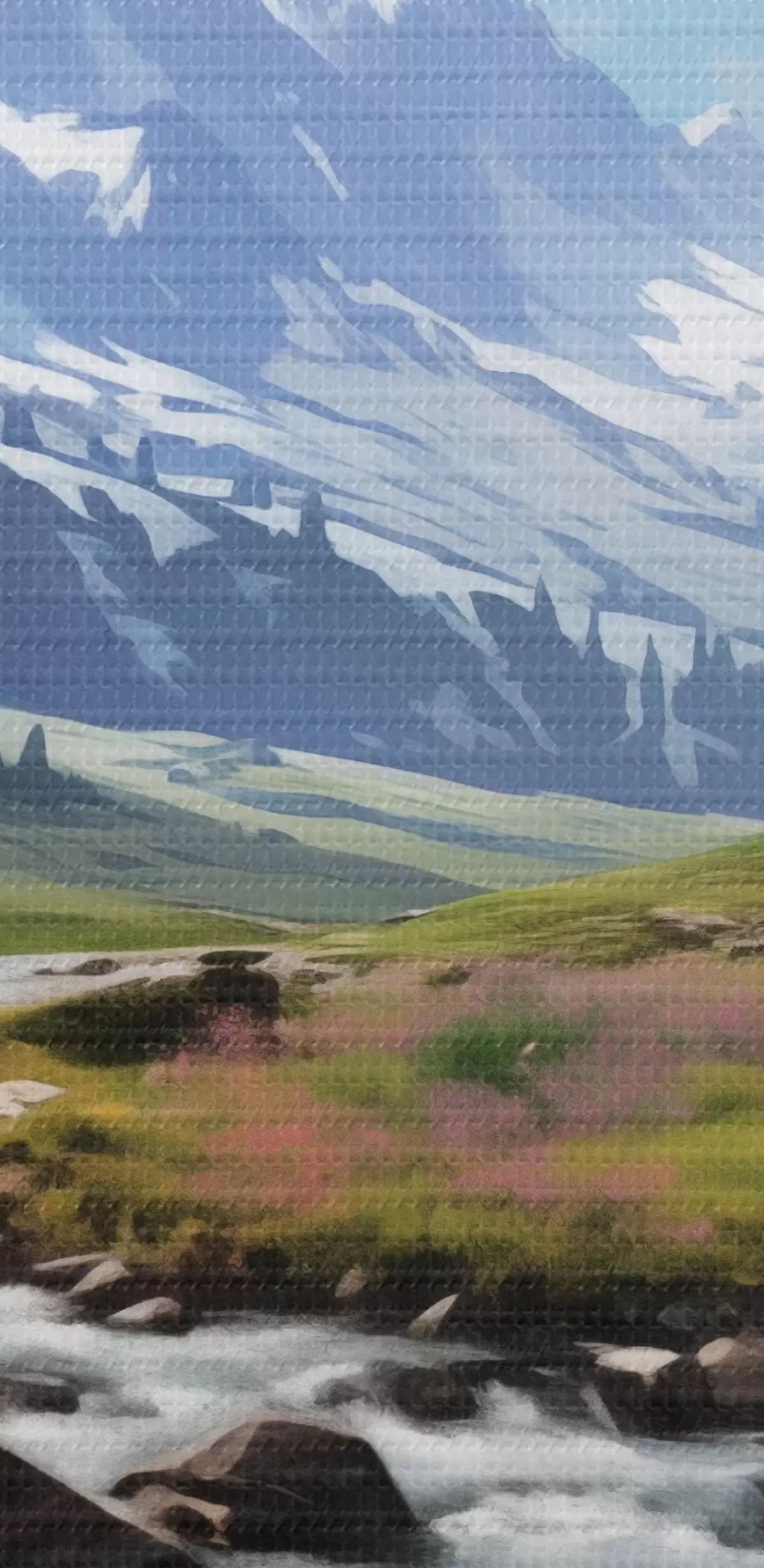 Wandbilder Eine Berglandschaft mit einem rauschenden Bach, blühenden Wiesen und schneebedeckten Gipfeln am Horizont unter einem strahlend blauen Himmel. s42563