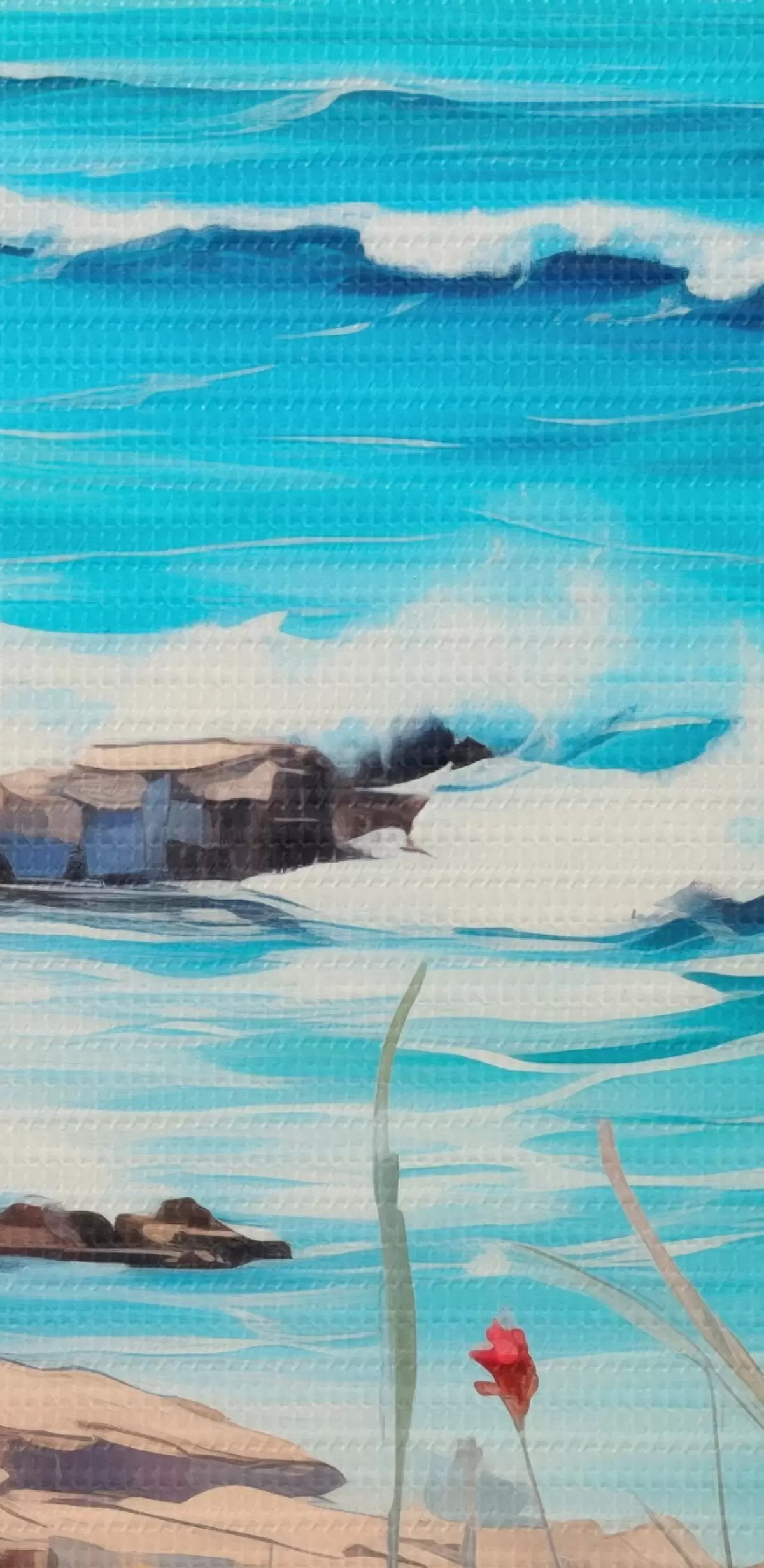 Wandbilder Eine Meereslandschaft mit türkisfarbenen Wellen, einem felsigen Ufer und leuchtenden Blumen im Vordergrund unter einem klaren blauen Himmel. s42568