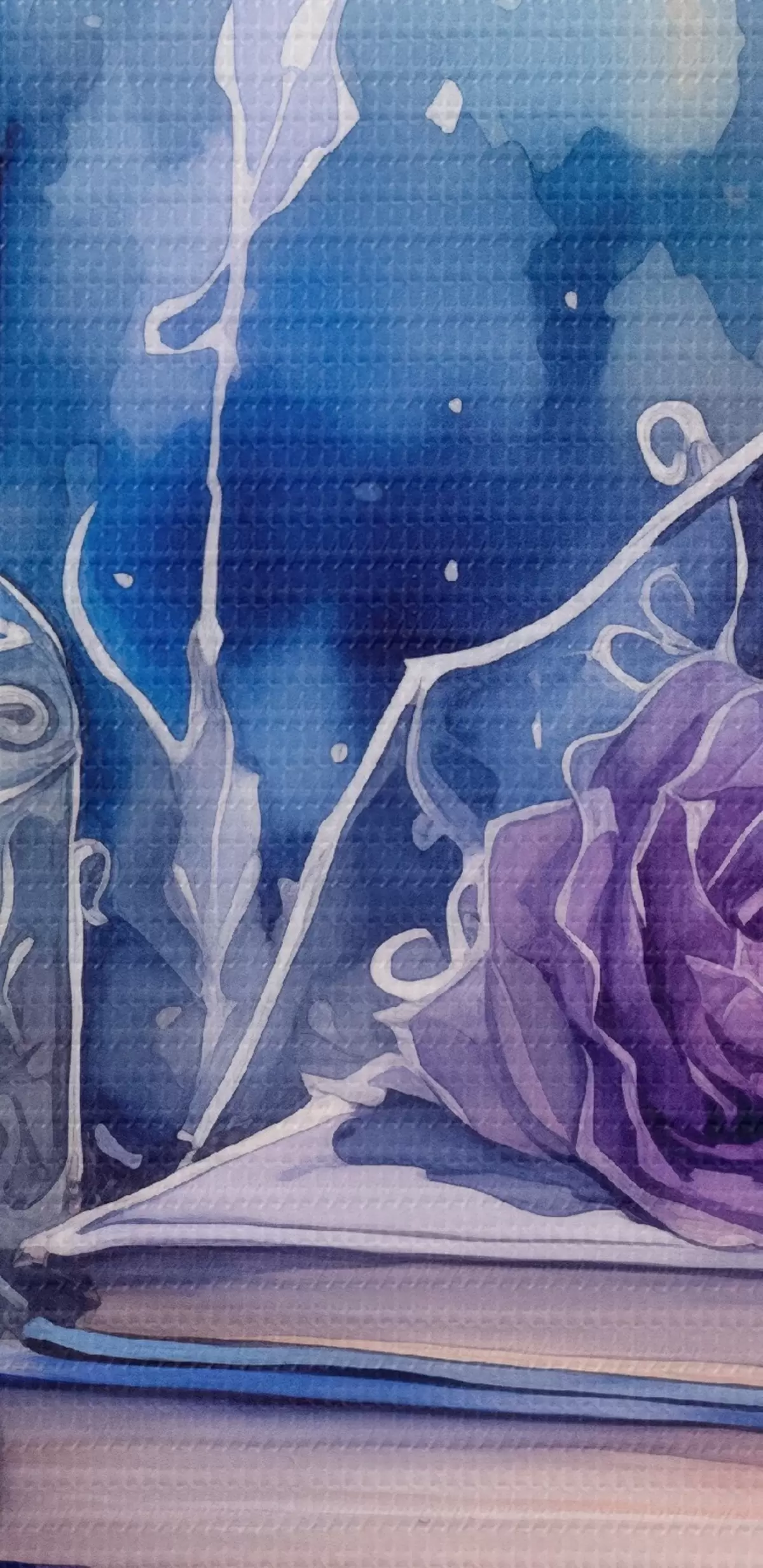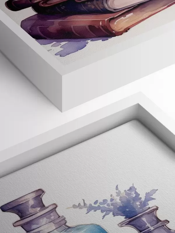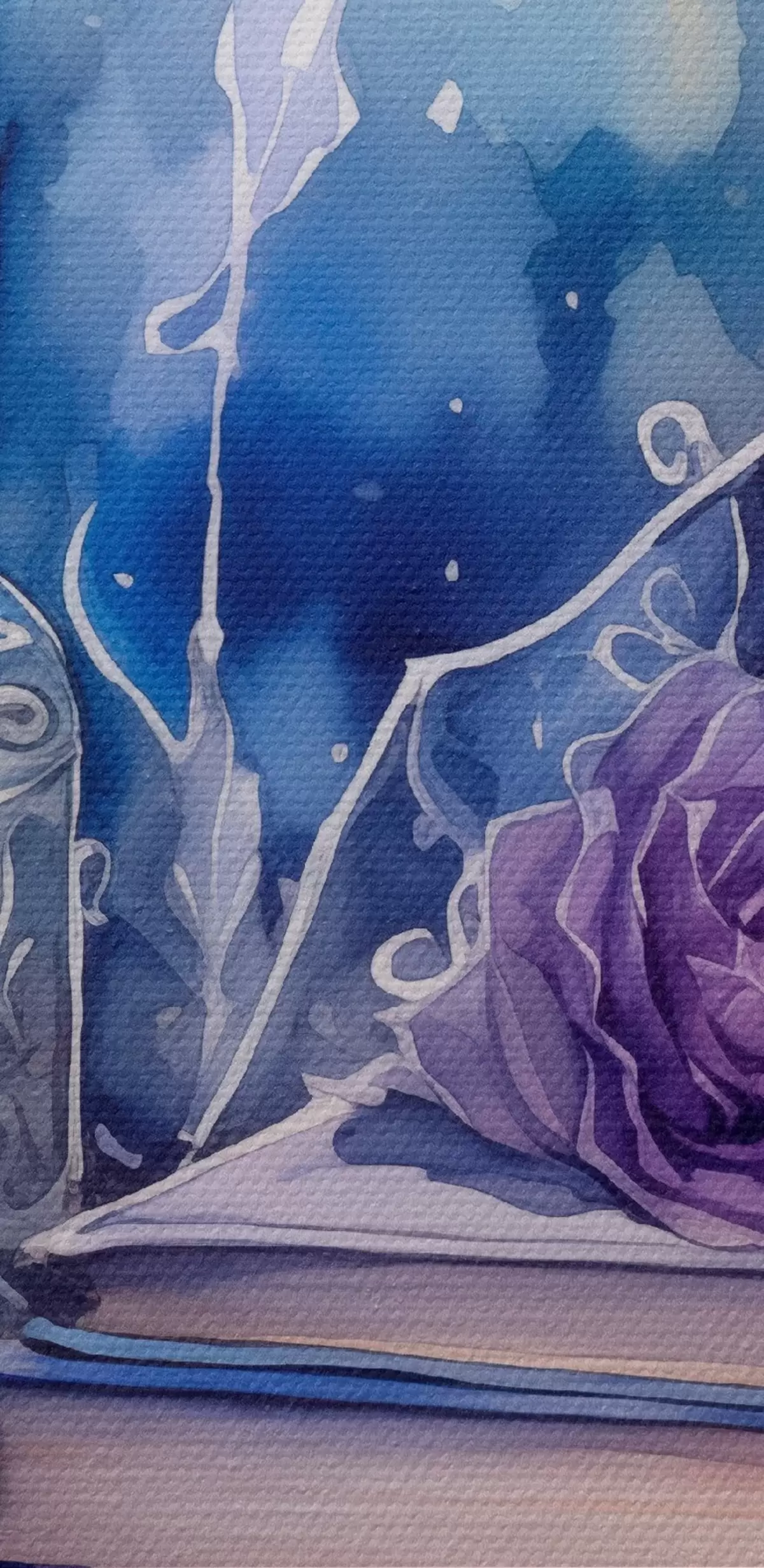 Wandbilder Ein Stillleben mit alten Büchern, Glasflaschen in blau-violetten Tönen und dekorativen Blumen. Art. s42574