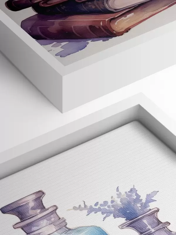 Wandbilder Ein Stillleben mit alten Büchern, Glasflaschen in blau-violetten Tönen und dekorativen Blumen. s42574