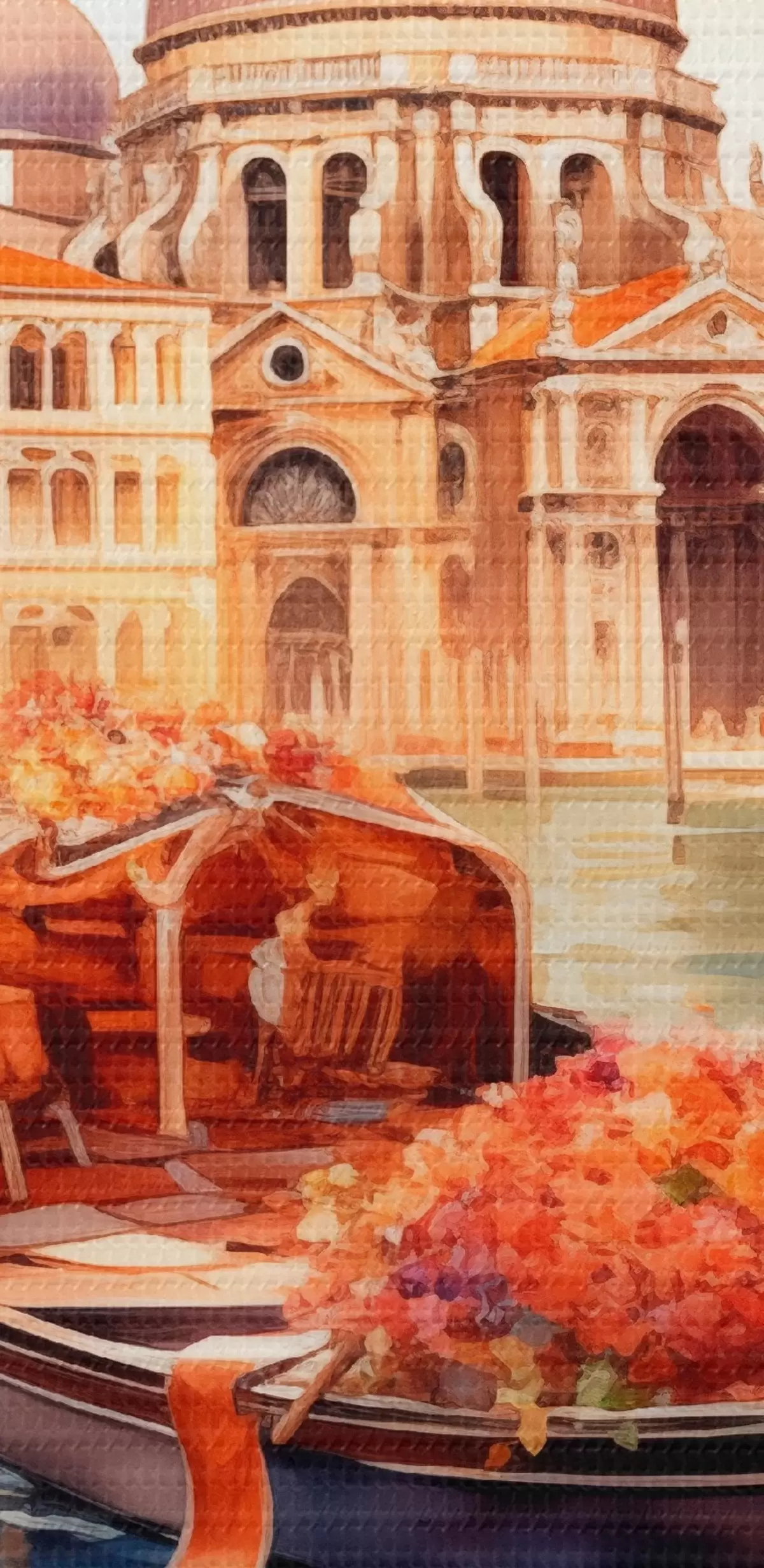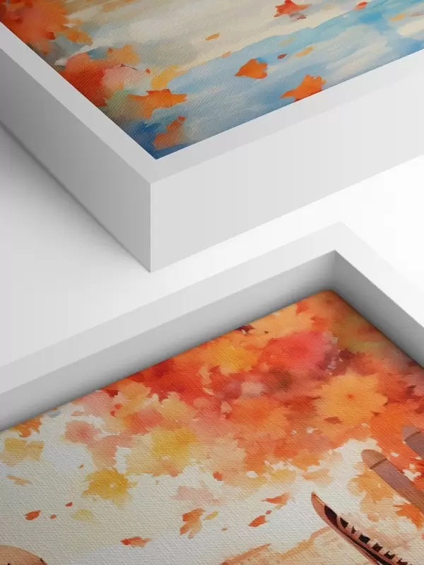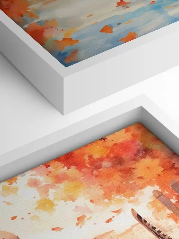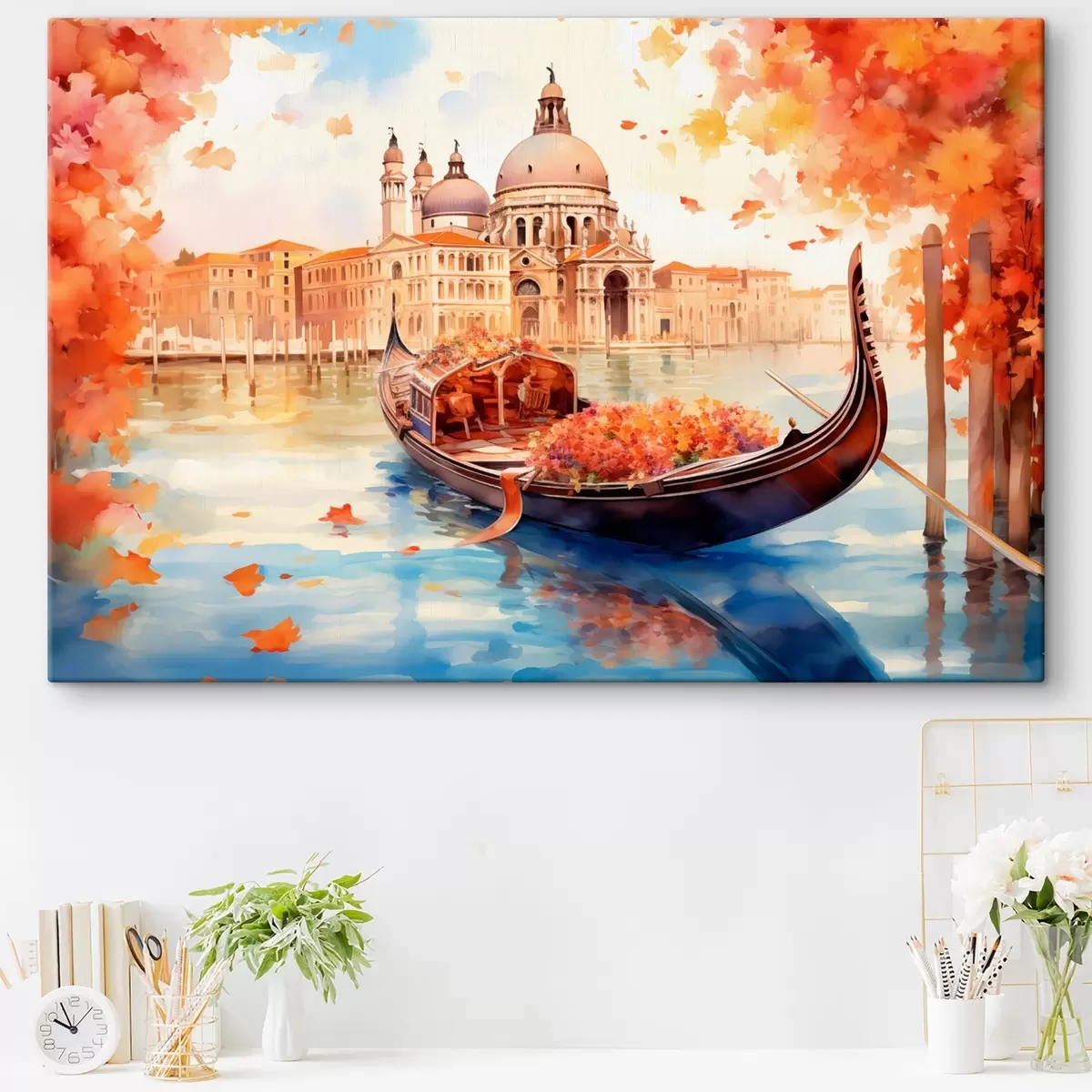 Wandbilder Eine herbstliche Ansicht von Venedig mit einer Gondel, umgeben von leuchtend orangefarbenen und roten Blättern, mit Spiegelungen von Gebäuden im ruhigen Wasser des Kanals. Art. s42576
