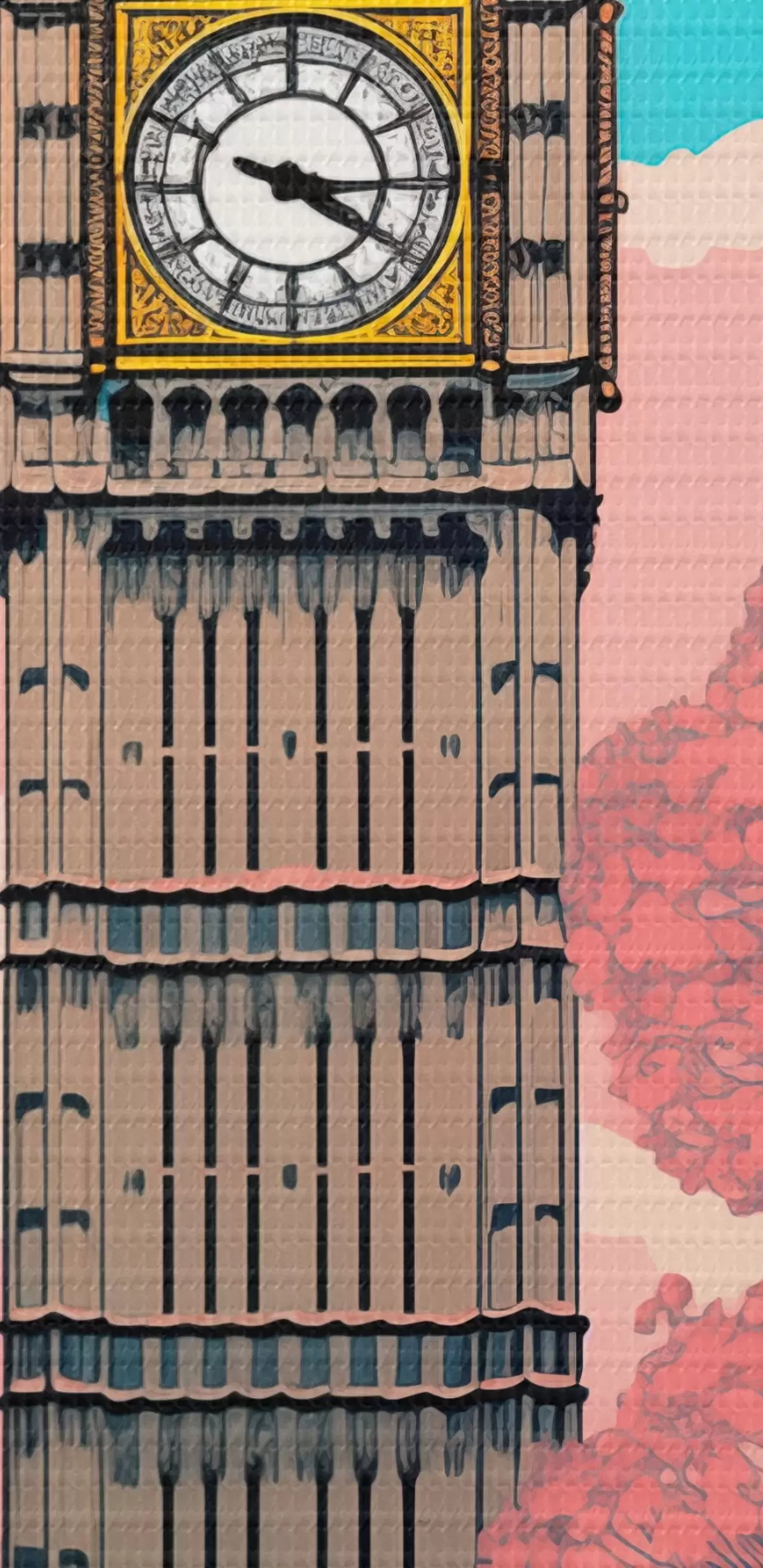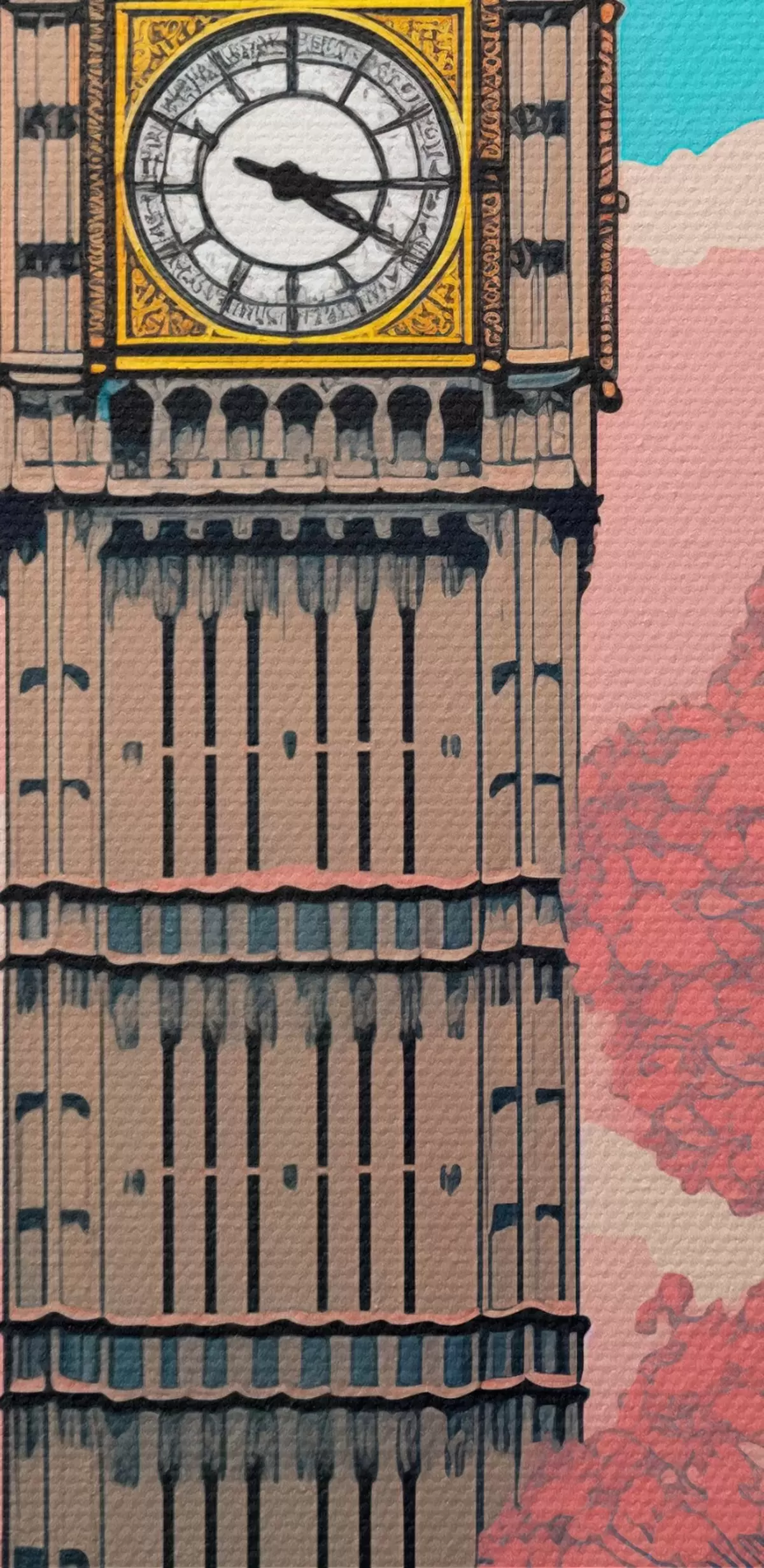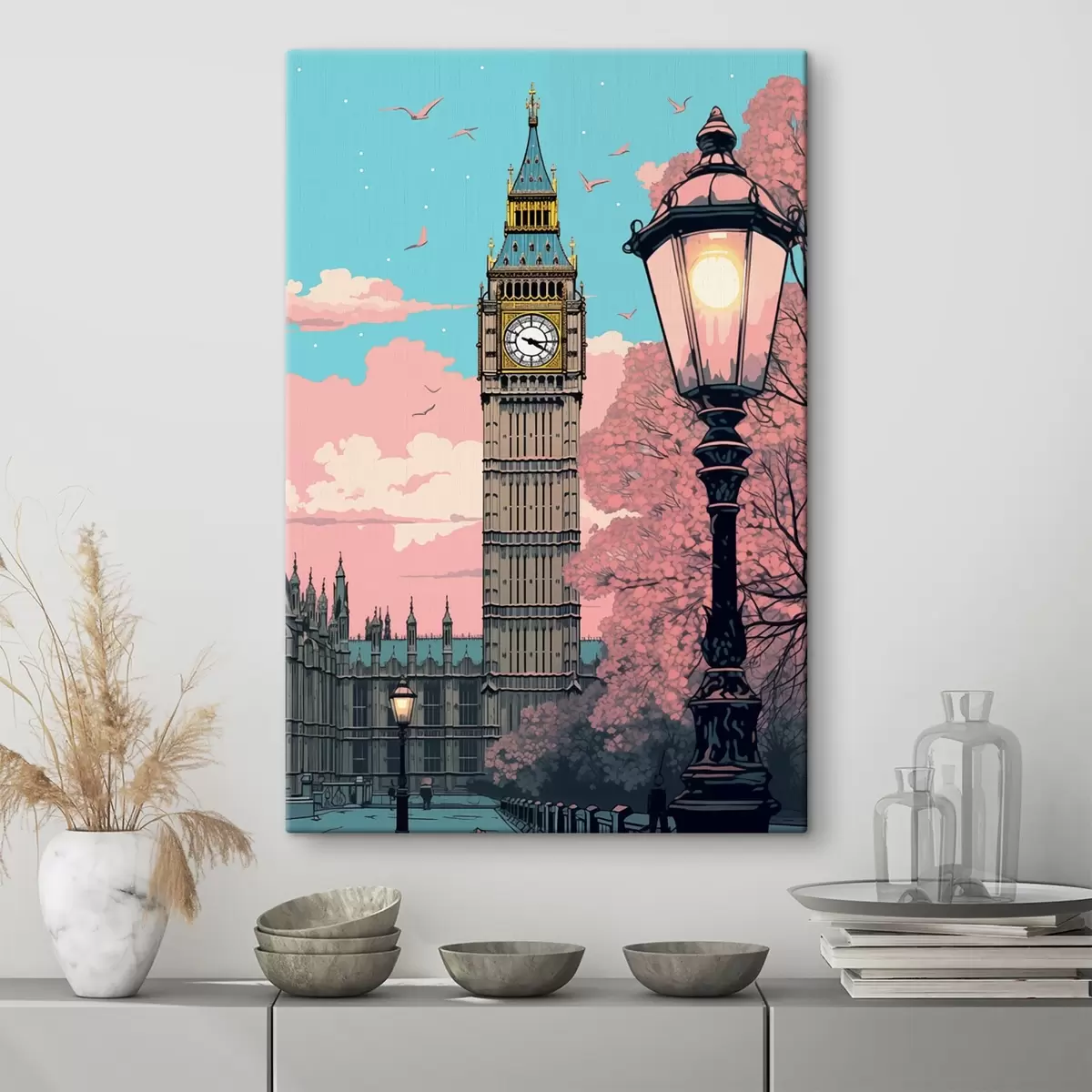Wandbilder Eine Ansicht von Big Ben mit frühlingshaften rosa Bäumen, einem strahlend blauen Himmel und einer alten Straßenlaterne im Vordergrund. Art. s42578