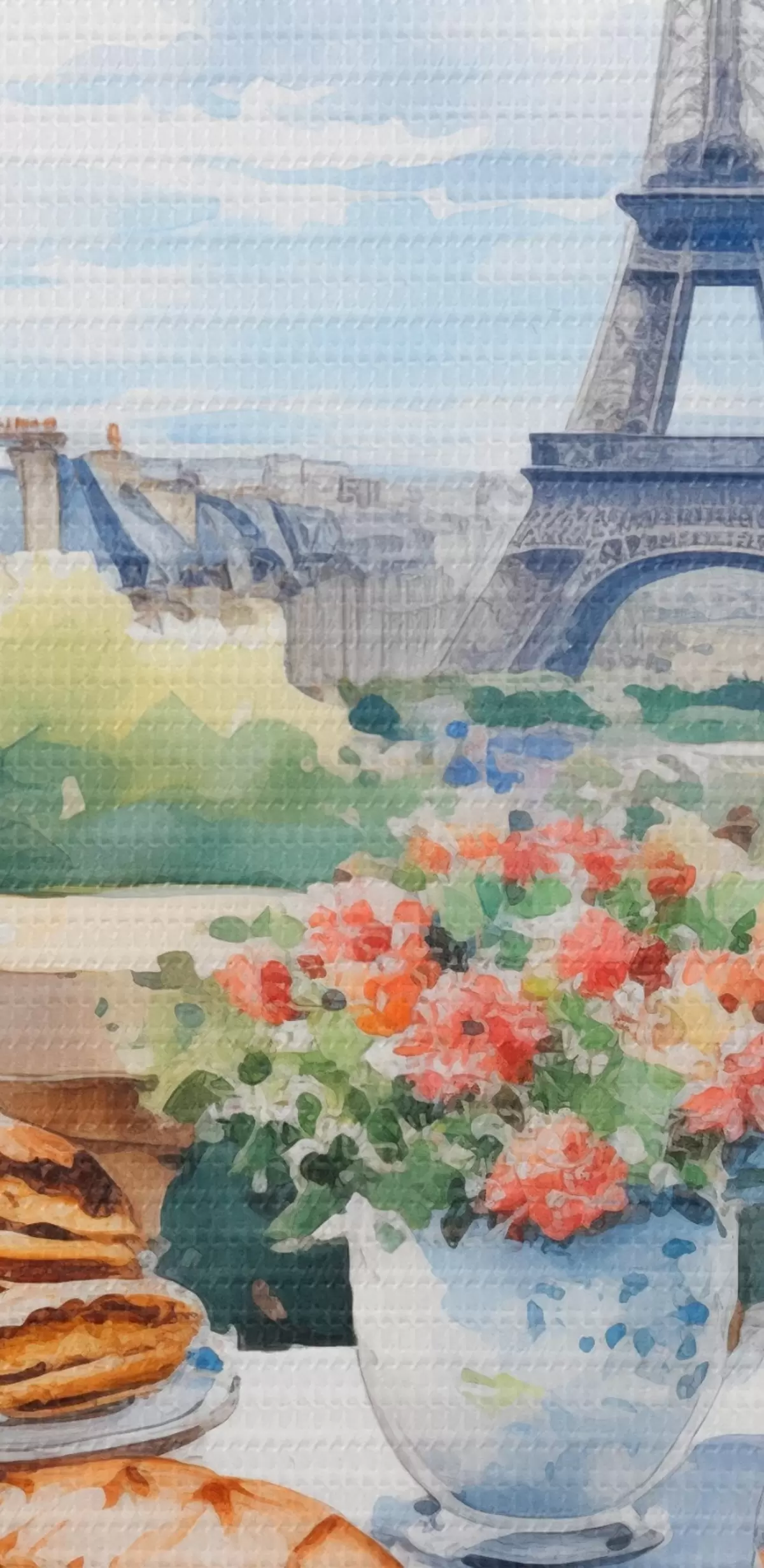 Wandbilder Ein romantischer Blick auf den Eiffelturm von einem Balkon mit einem gedeckten Tisch mit Desserts, Tee und Blumen in einer sommerlichen Atmosphäre. Art. s42579