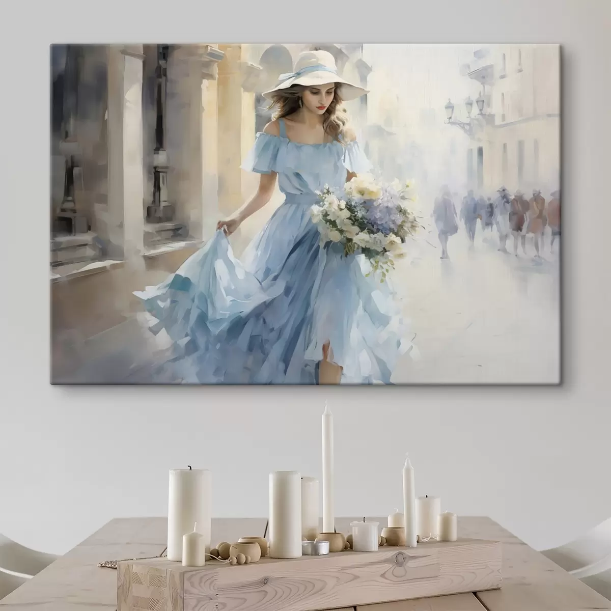 Wandbilder Ein elegantes Mädchen in einem hellblauen Kleid und Hut schlendert mit einem Blumenstrauß in der Hand durch die Stadt, in einer leichten und romantischen Stimmung. s42580