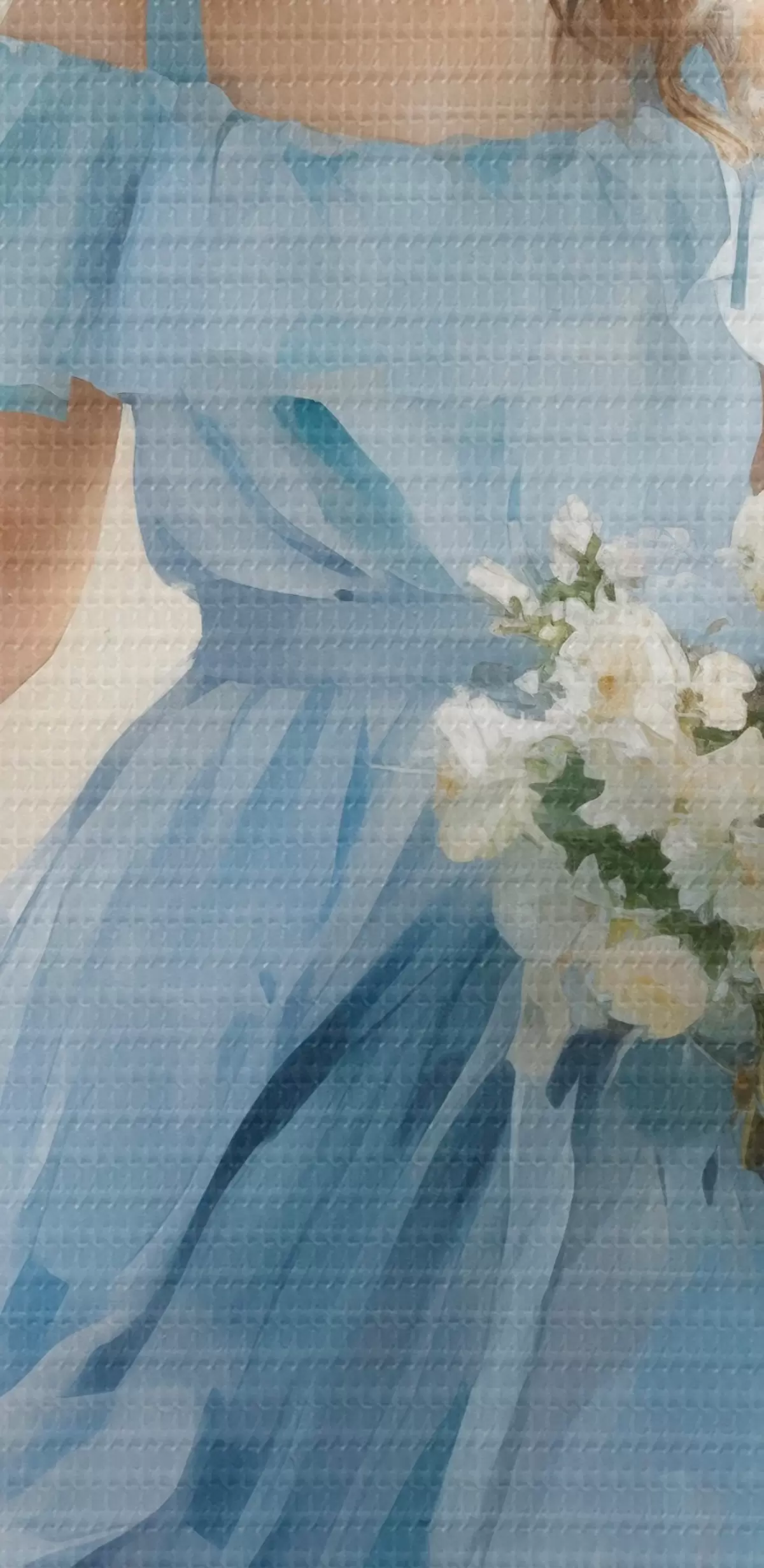 Wandbilder Ein elegantes Mädchen in einem hellblauen Kleid und Hut schlendert mit einem Blumenstrauß in der Hand durch die Stadt, in einer leichten und romantischen Stimmung. Art. s42580