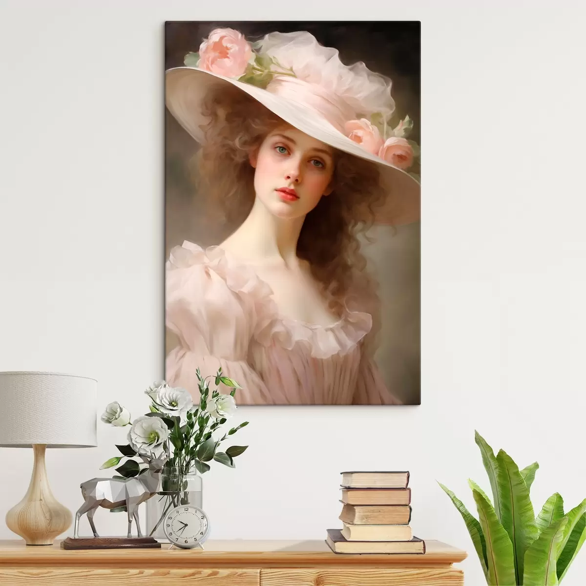 Wandbilder Porträt einer jungen Frau in einem zartrosa Kleid und einem blumengeschmückten Hut, mit romantischem und raffiniertem Ausdruck. Art. s42581