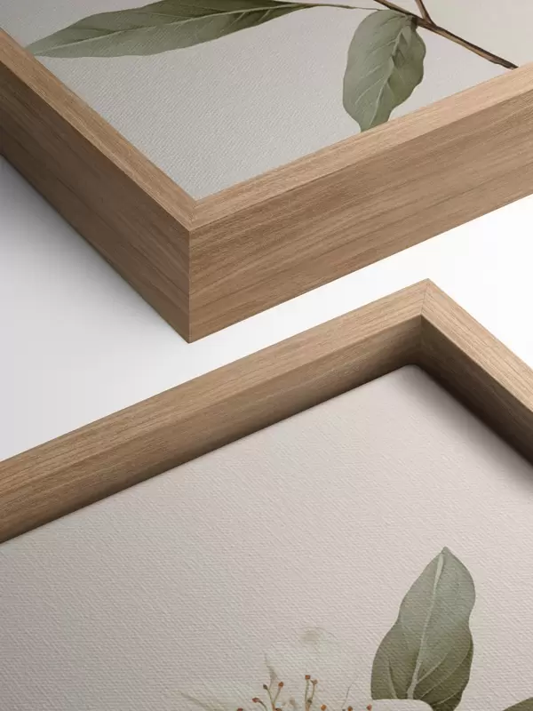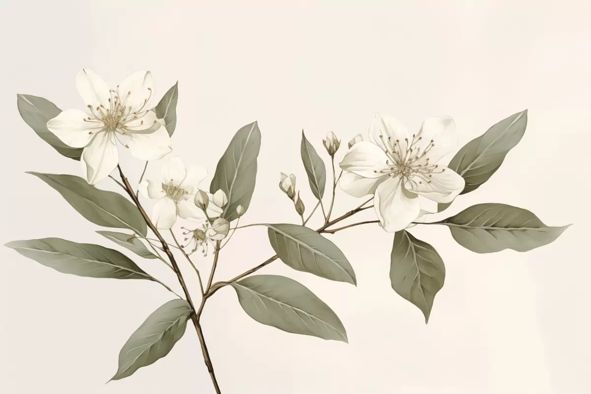 Wandbilder Ein zarter Zweig mit weißen Blüten und grünen Blättern auf hellem Hintergrund, mit weichen Details und einem eleganten Stil. s42583