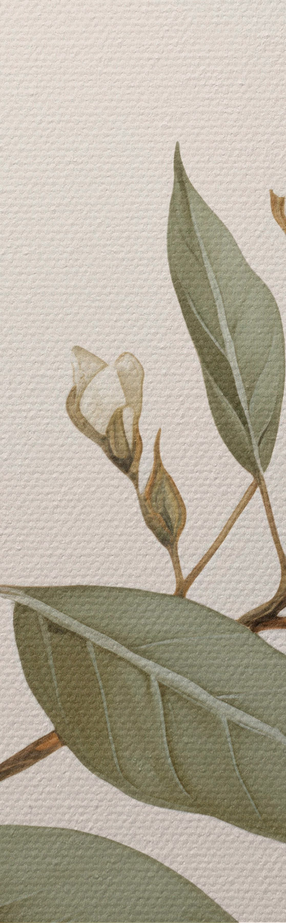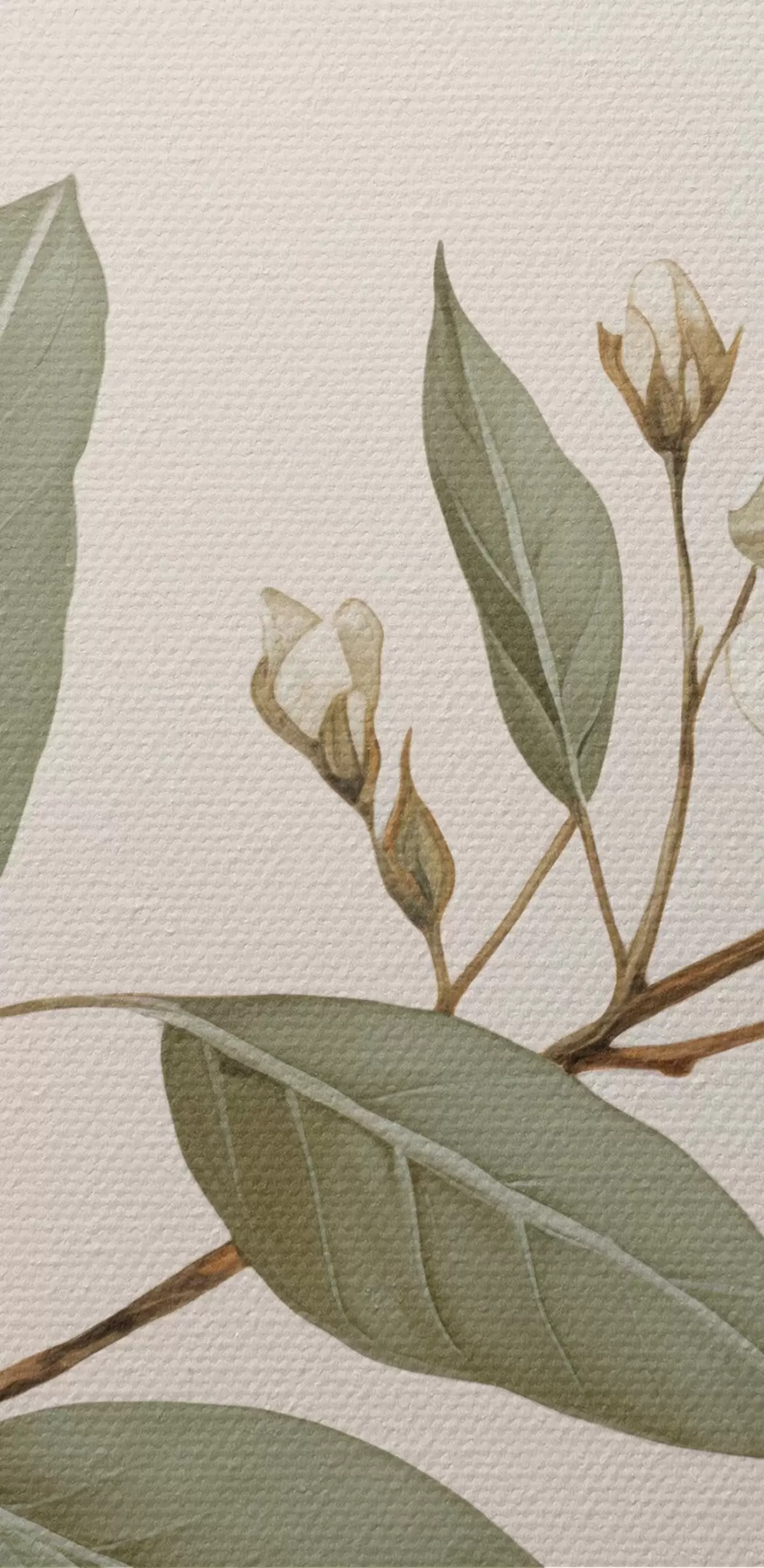 Wandbilder Ein zarter Zweig mit weißen Blüten und grünen Blättern auf hellem Hintergrund, mit weichen Details und einem eleganten Stil. Art. s42583