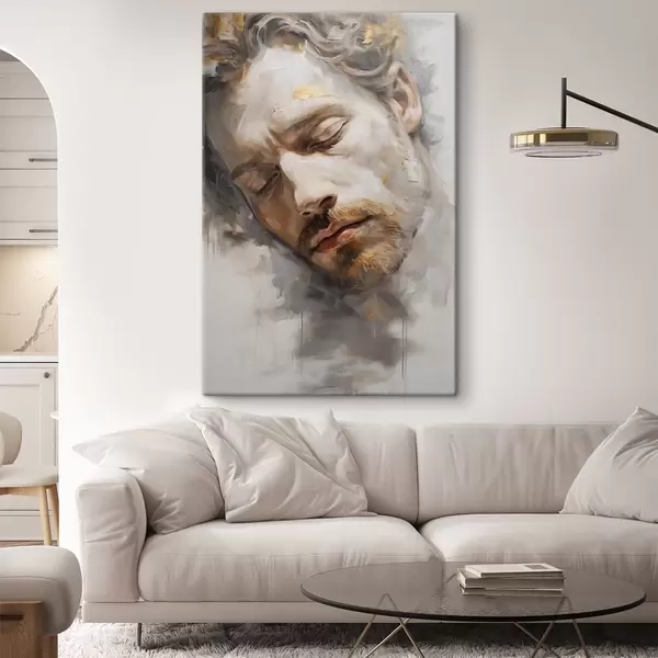 Wandbilder Ein abstraktes Porträt eines Mannes mit geschlossenen Augen, das in weichen, warmen Tönen und mit sanften Pinselstrichen gemalt wurde, die ein Gefühl der Ruhe hervorrufen. Art. s42621