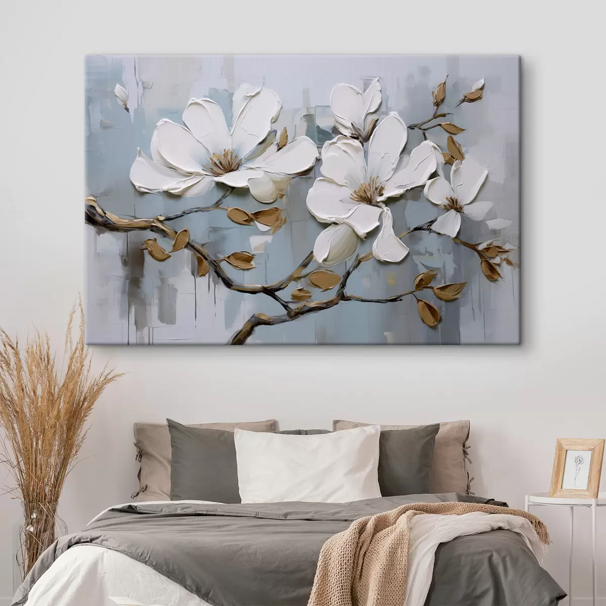 Wandbilder Weiße Magnolienblüten mit strukturierten Blütenblättern und braunen Blättern auf einem weichen blauen Hintergrund Ölgemälde Imitation s42711