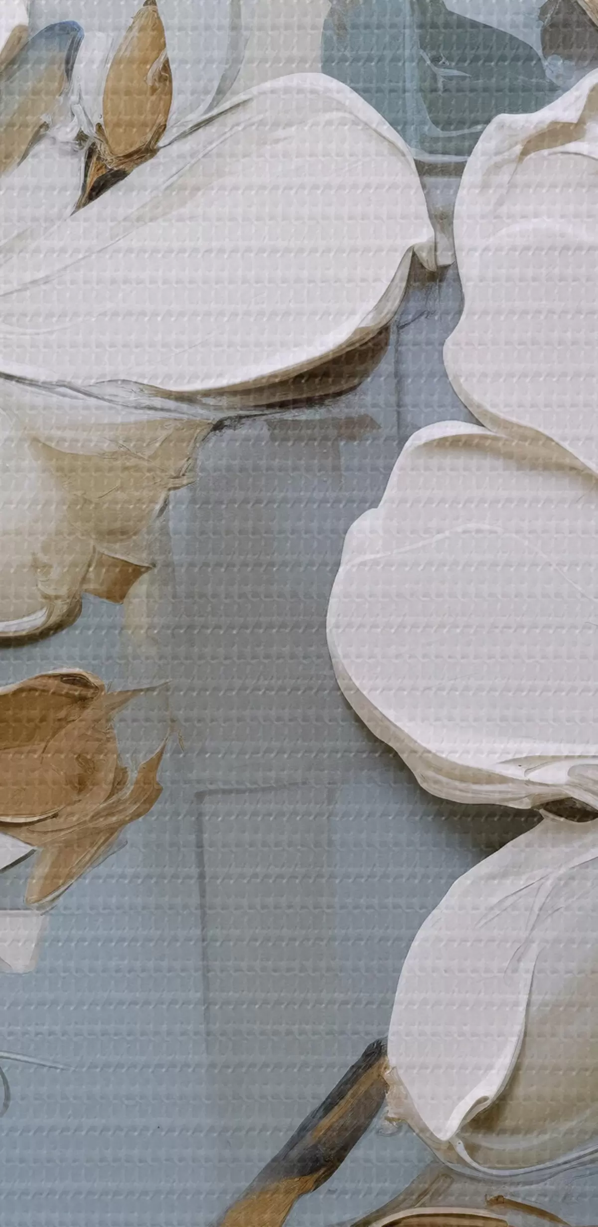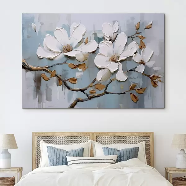 Wandbilder Weiße Magnolienblüten mit strukturierten Blütenblättern und braunen Blättern auf einem weichen blauen Hintergrund Ölgemälde Imitation Art. s42711
