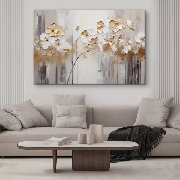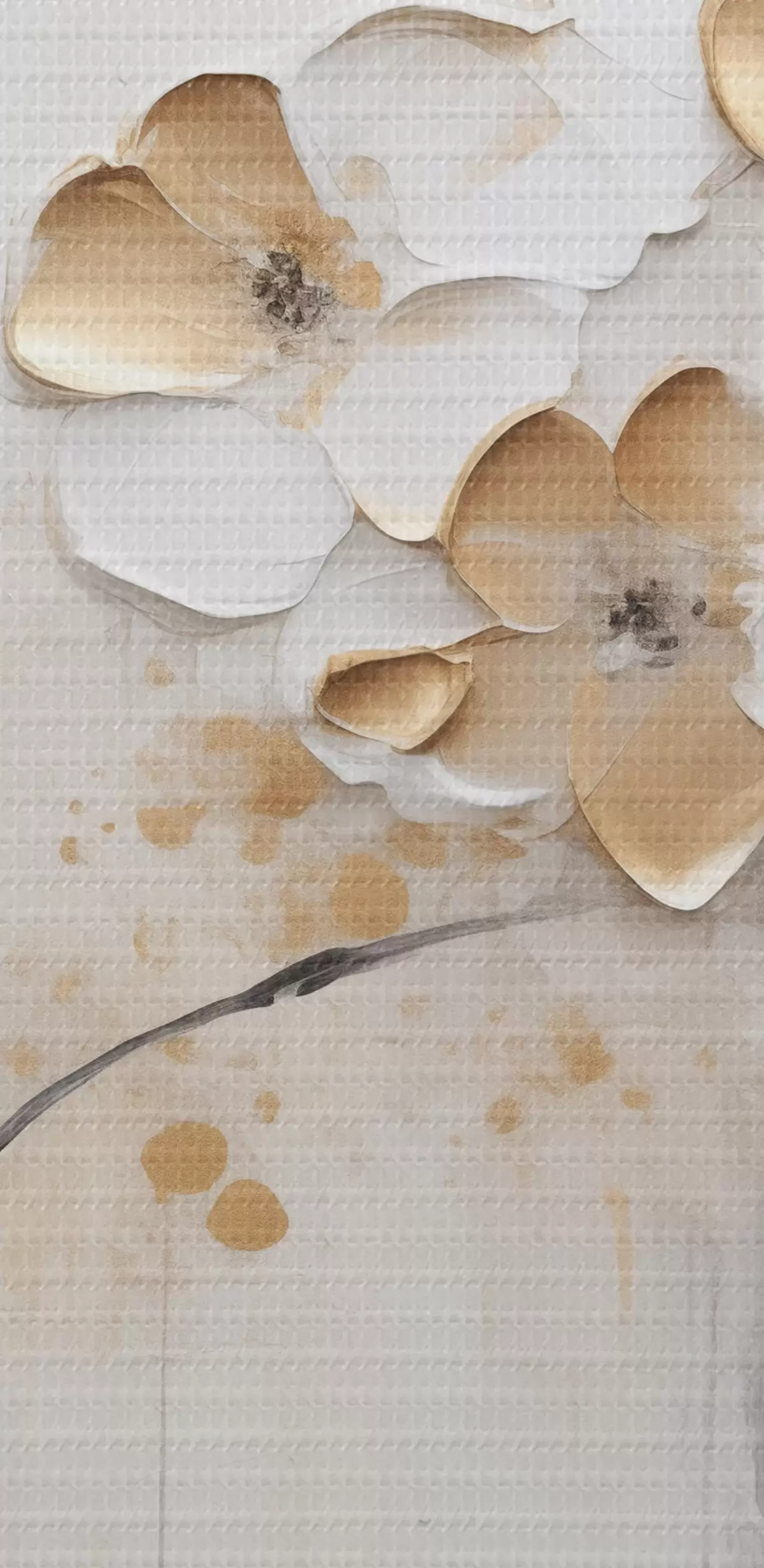 Wandbilder Blumen mit strukturierten Blütenblättern auf einem weichen, gedämpften Hintergrund mit abstrakten Farbspritzern und vertikalen Linien Art. s42713