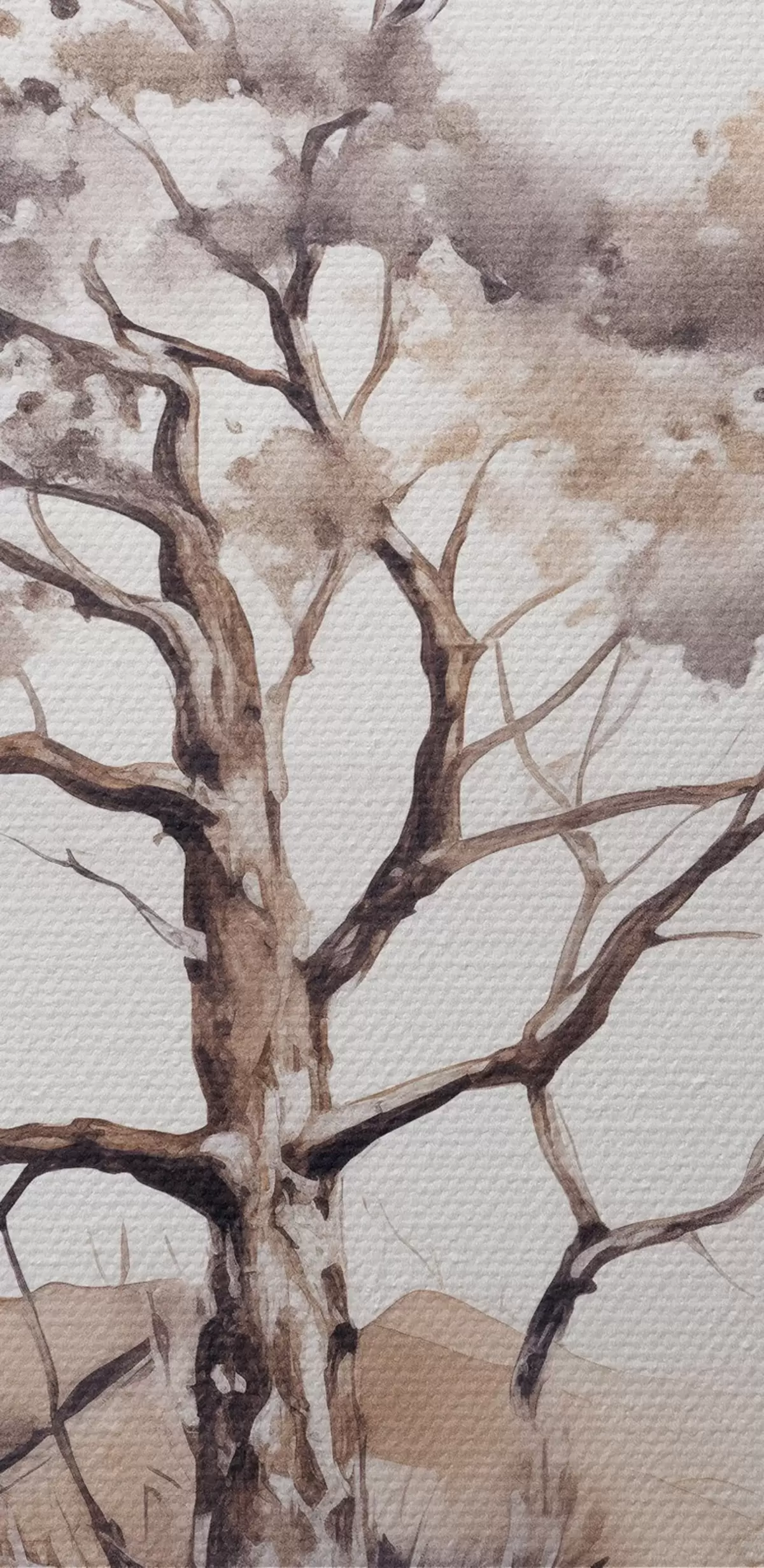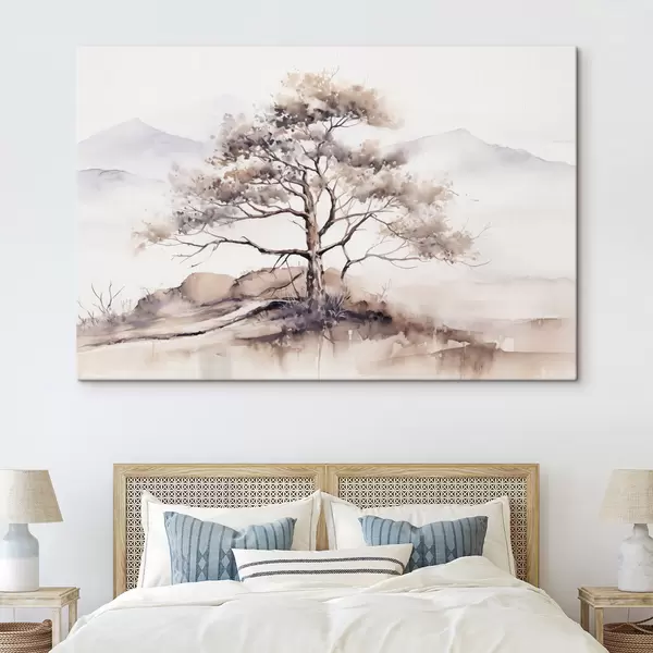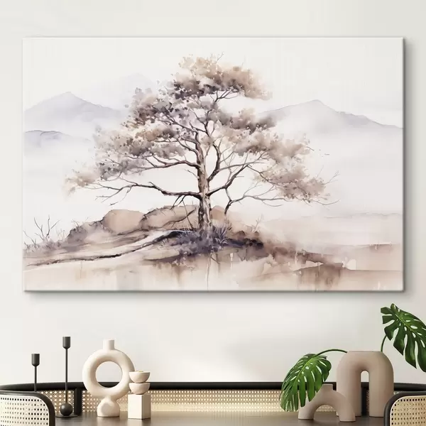 Wandbilder Ein einsamer Baum mit verdrehtem Stamm und spärlichen Ästen vor einem sanften, gedämpften Hintergrund aus Bergen Art. s42715