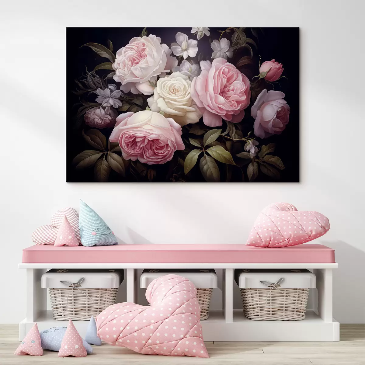 Wandbilder Rosa und weiße Rosen, arrangiert mit zarten weißen Blüten und grünen Blättern vor einem dunklen Hintergrund Art. s42721