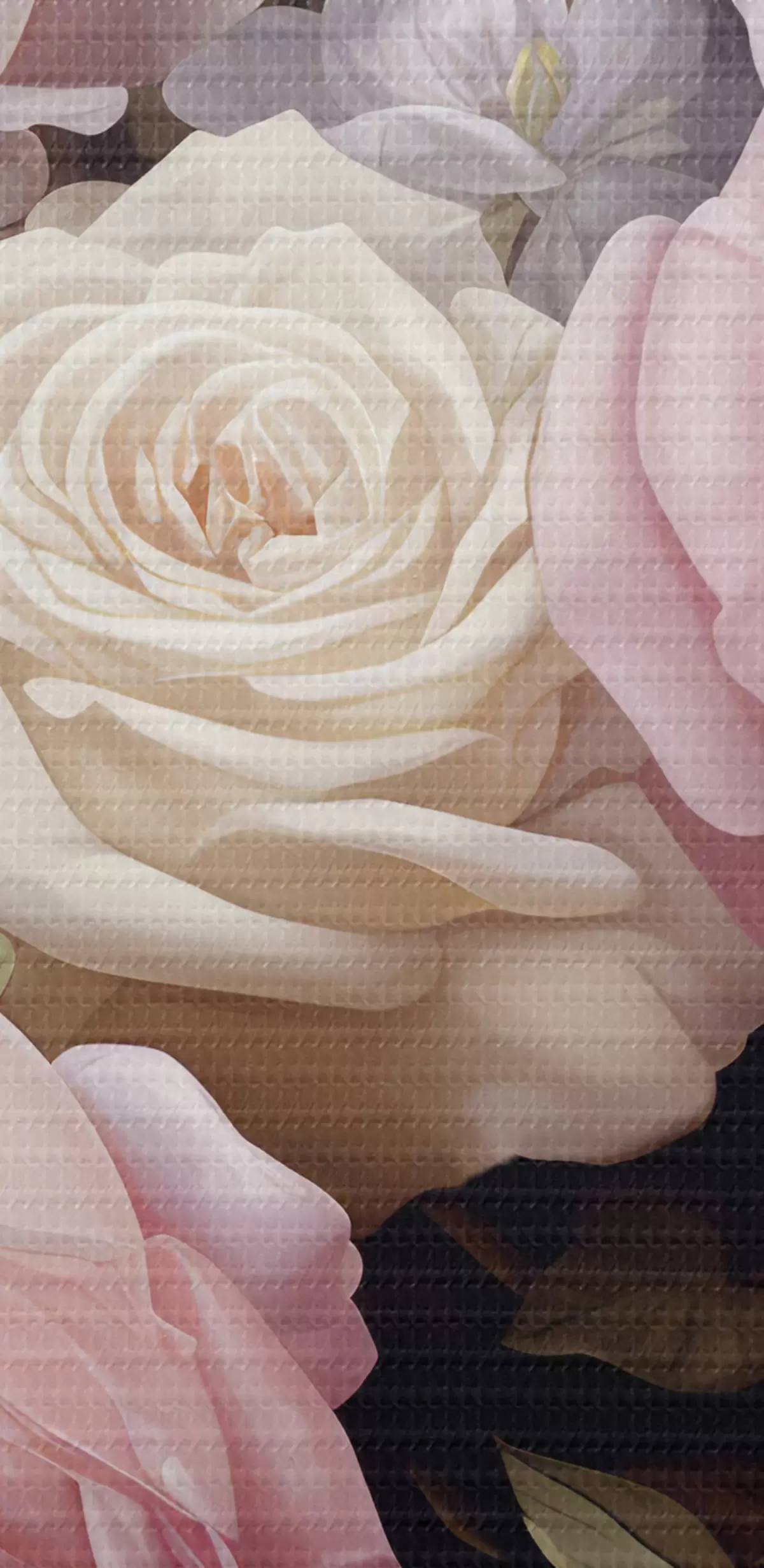 Wandbilder Rosa und weiße Rosen, arrangiert mit zarten weißen Blüten und grünen Blättern vor einem dunklen Hintergrund s42721
