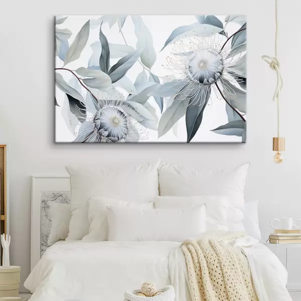 Wandbilder Detaillierte botanische Illustration von Eukaliptusblüten mit weißen Staubfäden, umgeben von zarten, hellgrünen Blättern Art. s42725